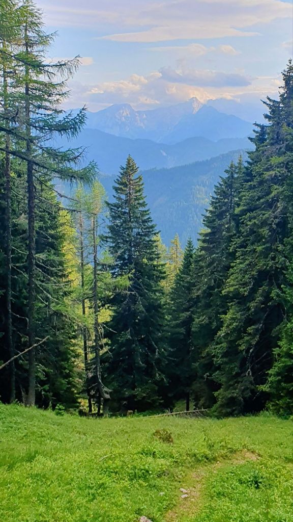 Najbliža planina je stožasta Uršlja gora, a cijeli dan nam je u kadru impozantna Raduha, čijim stazama još nisam hodala. Najradije bih da dođemo kad je prekrije snijeg. Vrhovi Kamniških Alpa su u tamnim oblacima, prijatelji su tamo te se nadam da ne pada.
