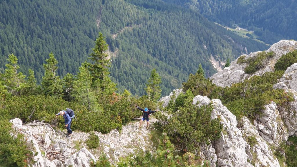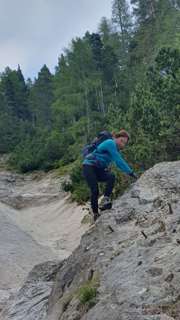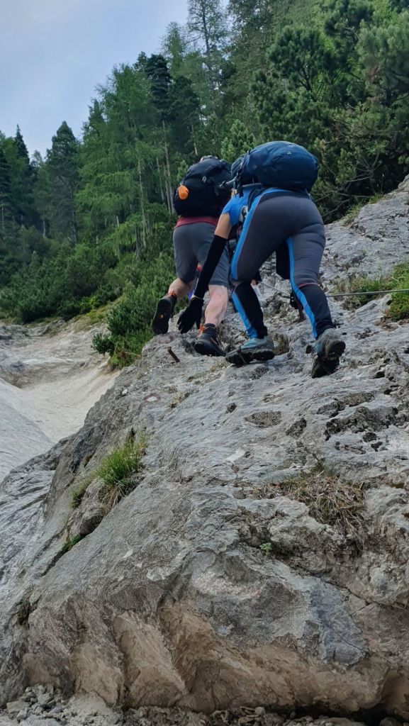 Spuštamo se prema domu putem kojim sam prošla zimi, dosta je dug, a na karti vidim da ima kraći, označen je kao T2-T3 i nema oznake ferate. Niti drvena iskrivljena tabla s natpisom “zelo zahtevna pot”, nije me uvjerila da je se klonim. Tek nakon pola sata kad su pred nama strmine osigurane sajlom i neugodno uske police u stijeni jasno mi je da ovo nije bila dobra ideja. “Vraćamo se.”, govorim, tu nema demokracije. – “Ovo nam je zamjena za treći vrh na koji prije nismo išli.”, većina šaljivo komentira ovaj strmi uspon dok se hvata stijene, jer ovo je uzbudljiva dionica, “trešnja na torti”, kaže Beti.