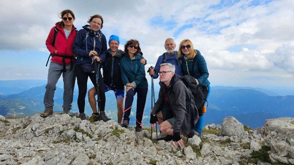 Povratak do raskršća na Kniepsovom sedlu i uspon na Pecu ostavljaju bez daha. Znojni smo i sretni da ni kap kiše nismo imali, iako sad mi se čini da je to baš svejedno – i tako smo mokri. Prostran vrh obilježen malim cepinom nudi otvorene vidike i blag vjetar. Zimus je puhalo baš nemilosrdno. Pogledajte zimski uspon za usporedbu: Peca / Kordeževa glava (2125 m), Karavanke, Slovenija