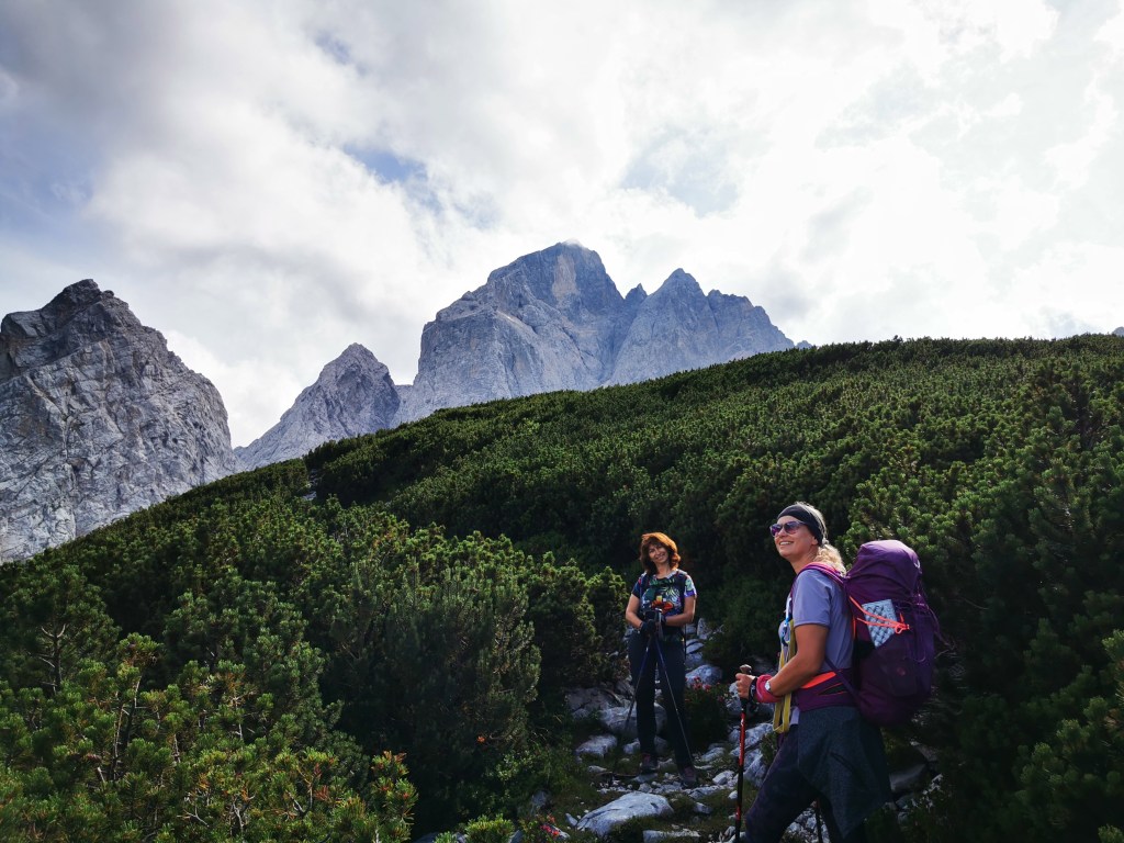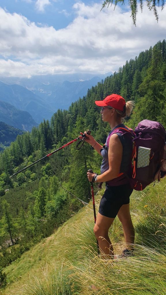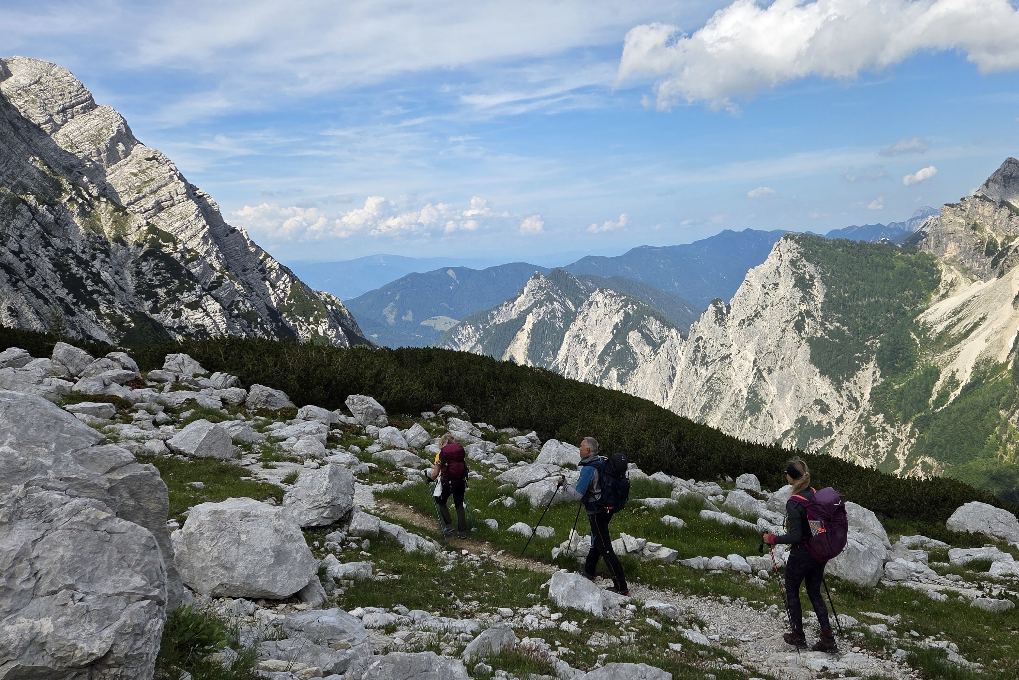 Ruksaci su nam teški zbog opreme za samoosiguranje, a dan jedva da može biti topliji. Zato je staza lijepa, ugodna, pitoma, čak se i malo spušta – to ćemo naravno platiti kasnije. Hodamo ogrnuti hladovinom starih ariša s širom otvorenim prozorima u sivi alpski svijet, gledamo Prisojnik, Razor, Bovški Grintavec…