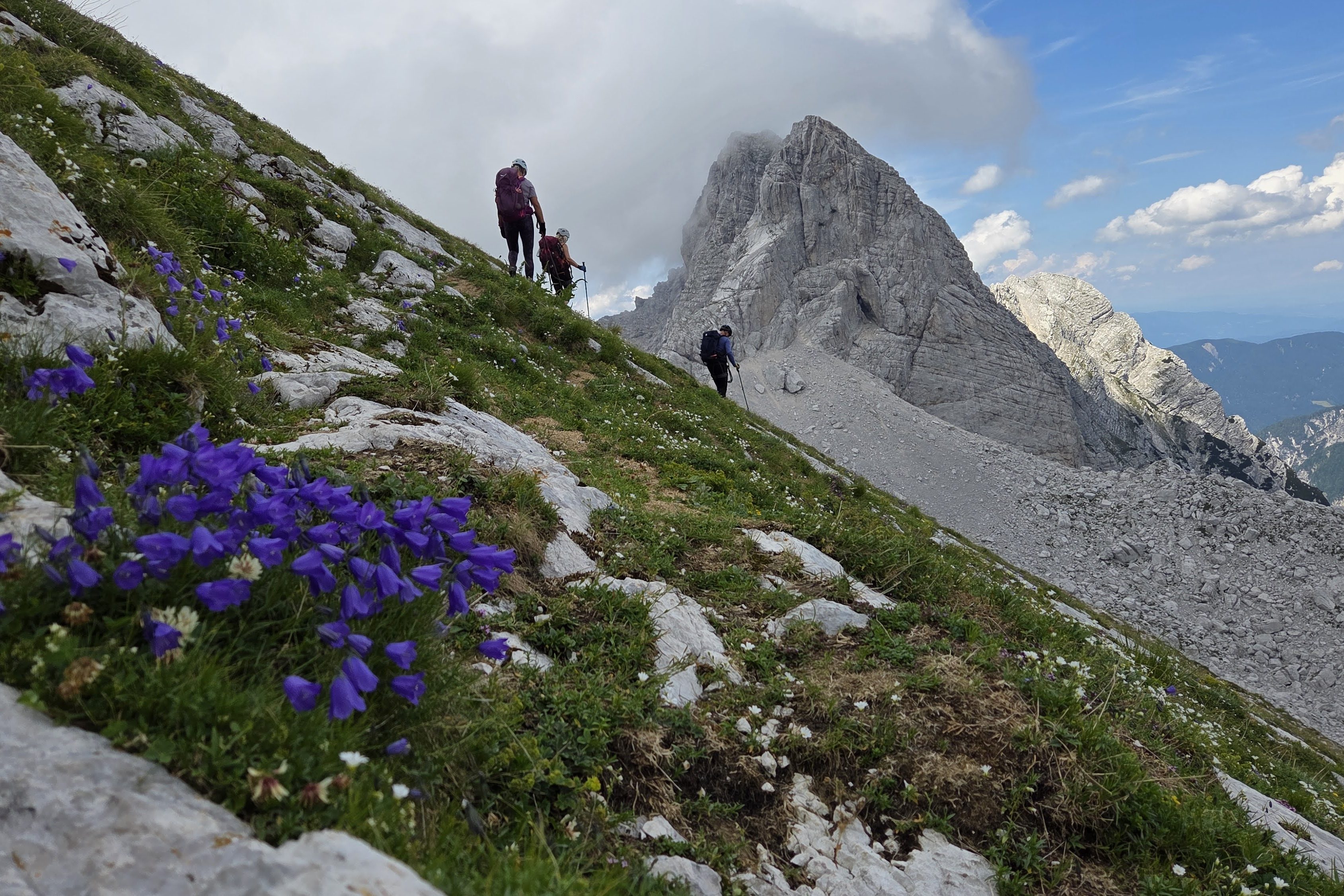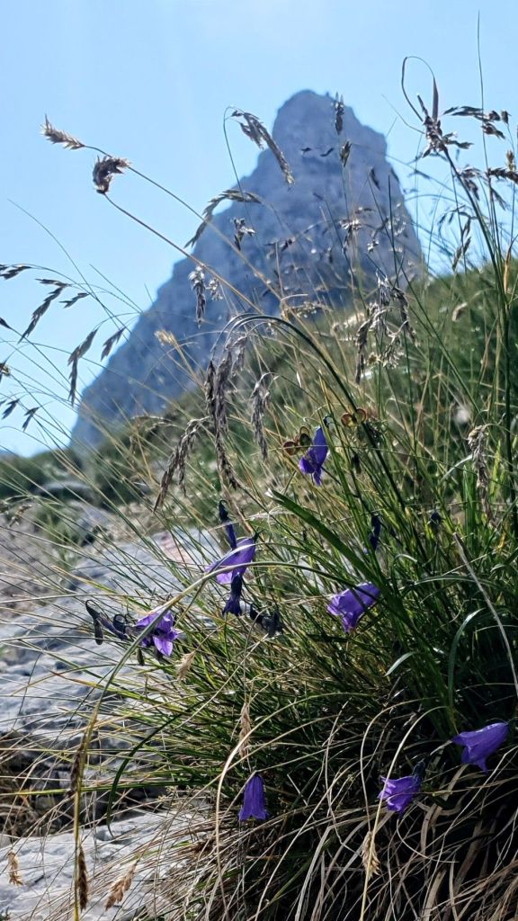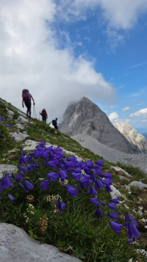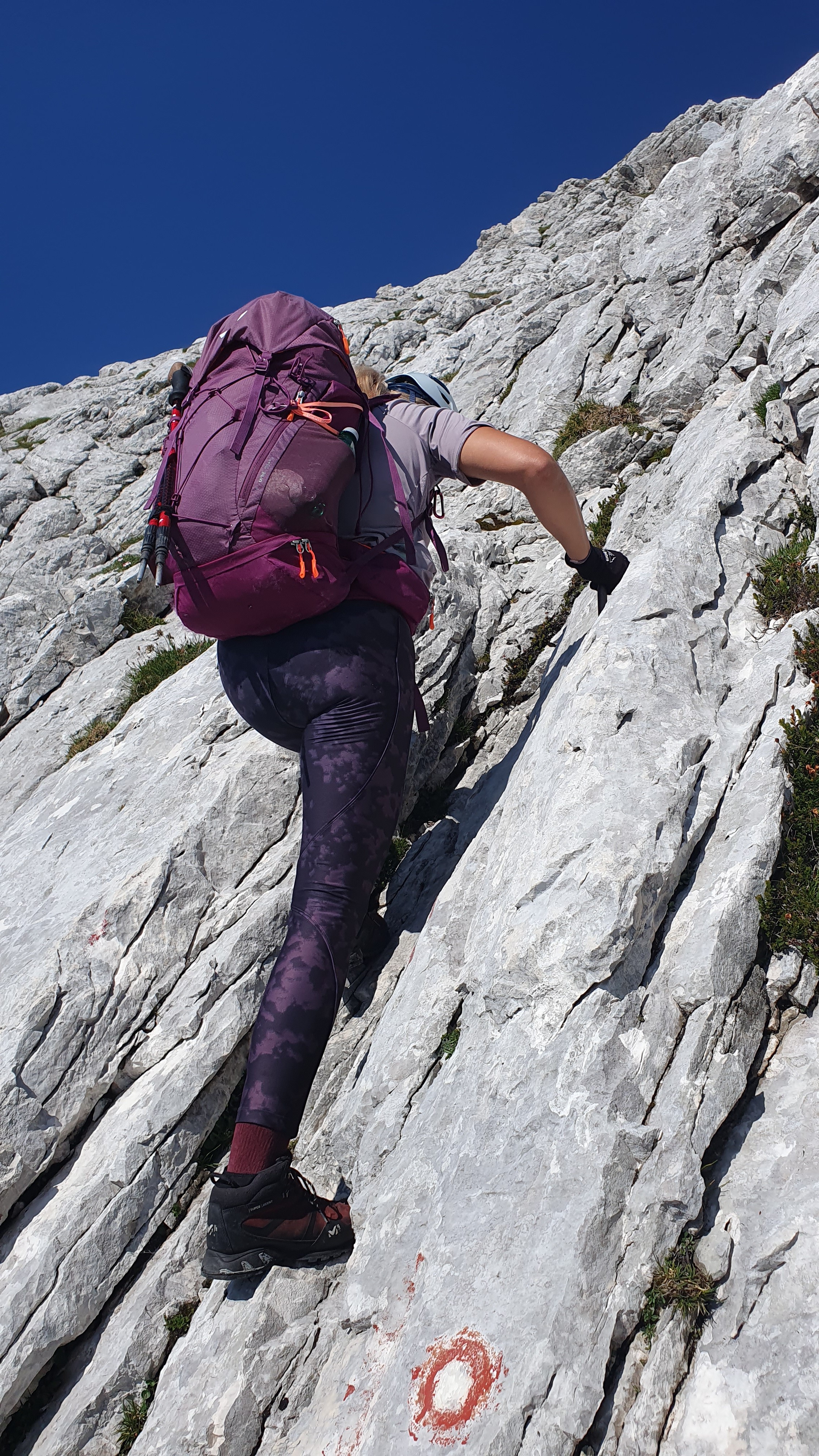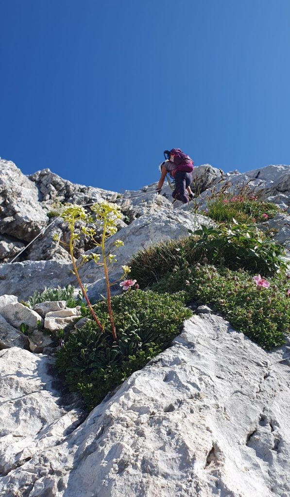 Uvodni dio preko sipara vodi nas do staze u stijeni osigurane sajlom. Puno cvijeća raste iz kamena, ne mogu vjerovati da imamo ovako krasan dan za uspon, a za takav krasan/sunčan dan obavezno je imati sa sobom puno vode. Nosim dvije litre i jedan izotonik, no teret je to od najmanje šest kila, a penjemo se i ruksak vuče unazad.
