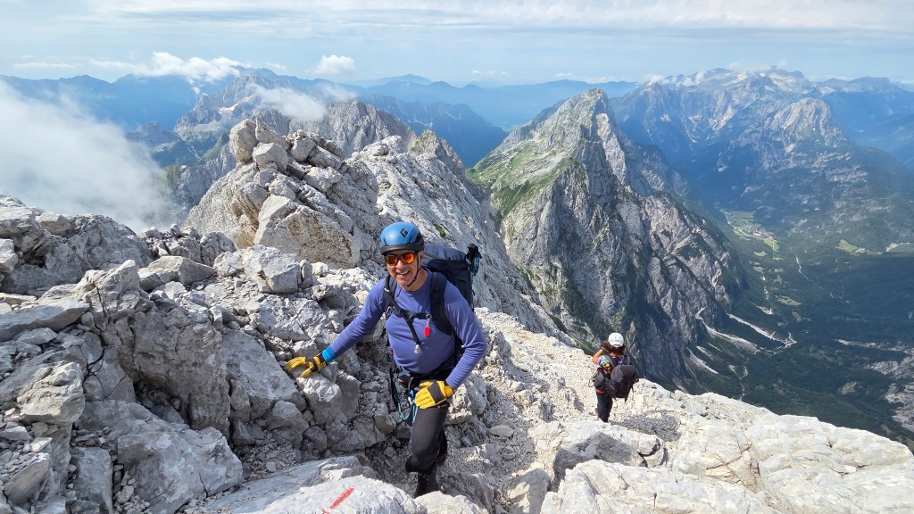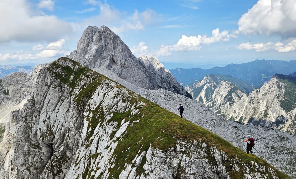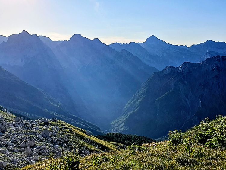 Mjerkam tu srebrnu krunu napunjenu kamenjem na šestom vrhu po visini u Sloveniji, uzdignutom iznad tri doline: Koritnica, Trenta i Tamar, koja nosi titulu Kralja gora i nema lakog načina da se do nje dođe. Najbliži vrh nam je Mangart, a tu su i nestašne Ponce, prostrani Kanin, talijanski dio Julijskih Alpa i Triglav – najviši u ovom području.