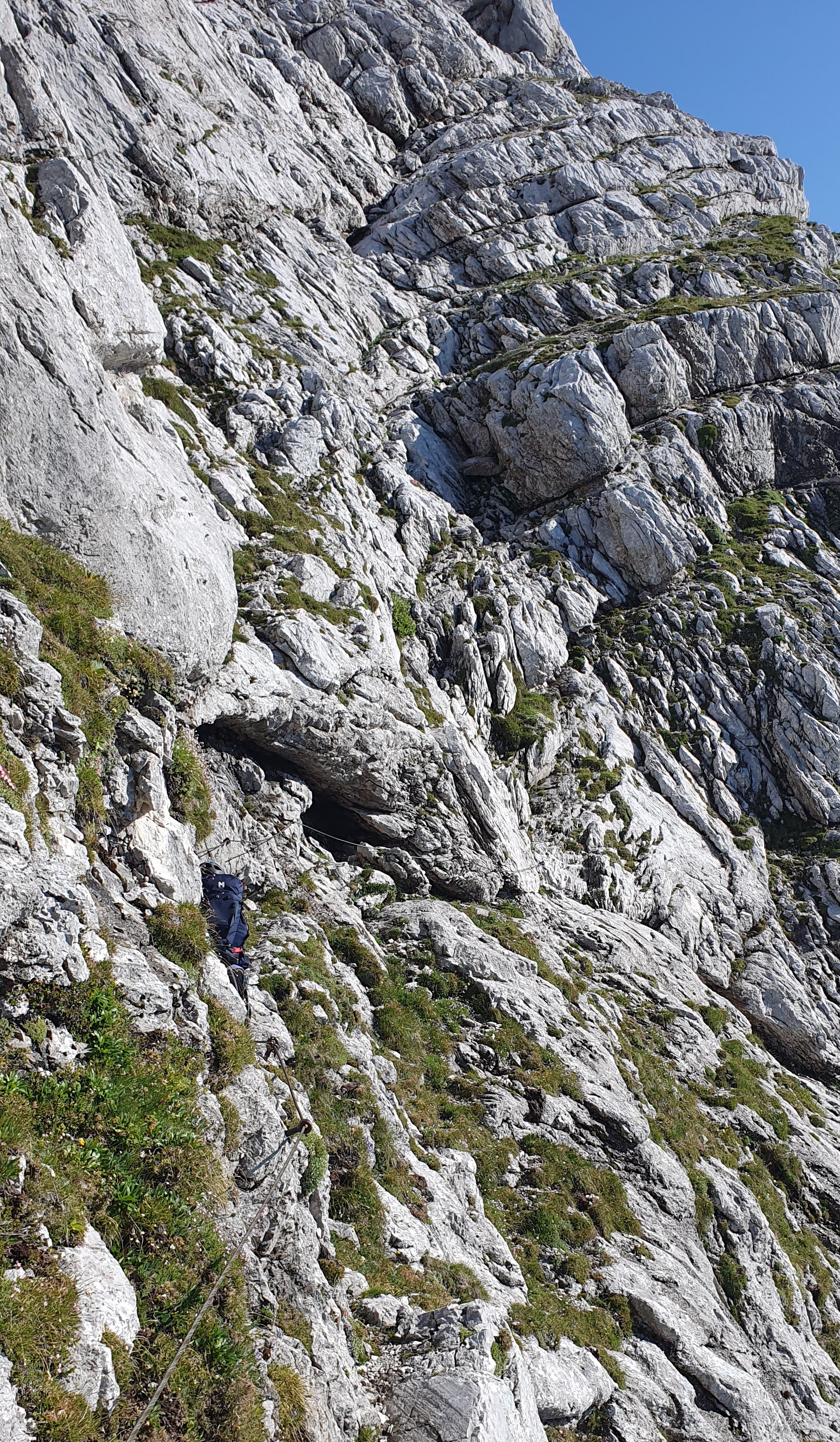 Nastavljamo. “Evo, vidim dionicu osiguranu sajlom. Sad će biti lakše.” Da, na kratko. Brinemo se za drugi dio grupe, imaju poneku slabiju kariku. “Nazvat ću ih da im kažem da se vrate istim putem, ovo je zajebano.”, zove Dražen, ali nema signala. Nailazi troje Austrijanaca, pitamo ih kakva je dalje staza, ima li osiguranja. “Uf, jako malo.”, znaju da to nije ono što želimo čuti, “Uglavnom je isto ovako.”, odgovaraju sućutno. – “Naići ćete na naše prijatelje, recite im da mislimo da je bolje da se vrate istim putem, jer je ovaj grozan.” Obećaju i odlaze. Prema gore je uvijek lakše.