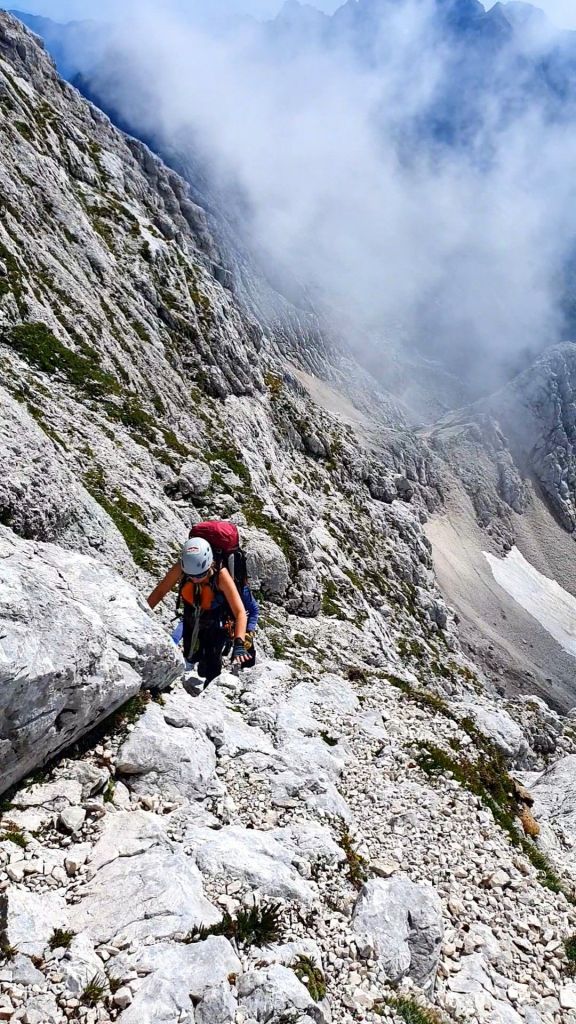 Iznenađujuće okomito dolje , zatim splet krušljivih polica, opet otpenjavanje unatraške, strmo, usko, koso, posuto sitnim šljunkom – sklisko… A, joj, pa što je to? Rješavamo dionice strpljivo, bez glasa, bez zvuka kamena, jer nijedan ne pomaknemo, hodamo kao po jajima od prepelice, dio po dio, jasno nam je da je opasno, da je izloženost ogromna.