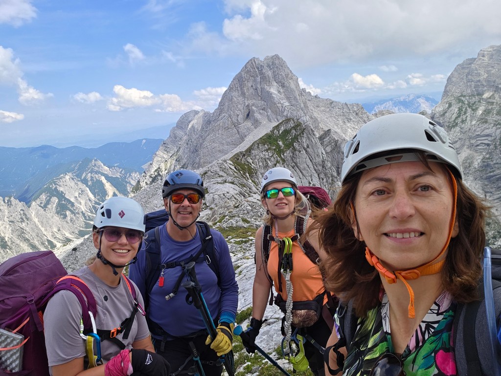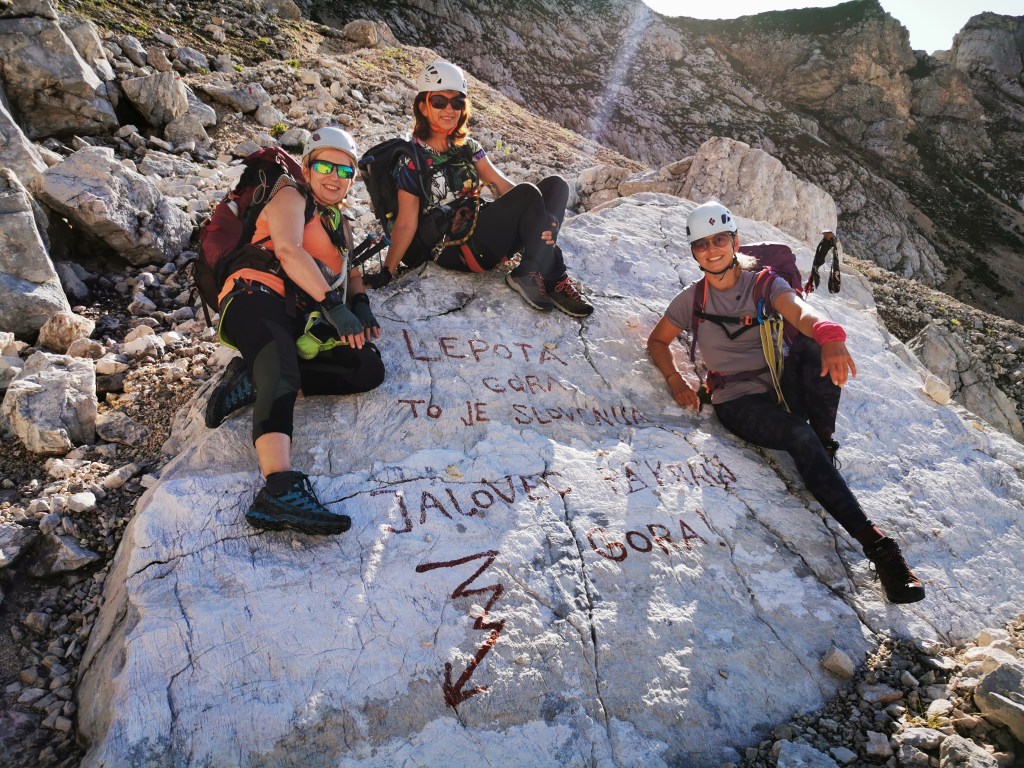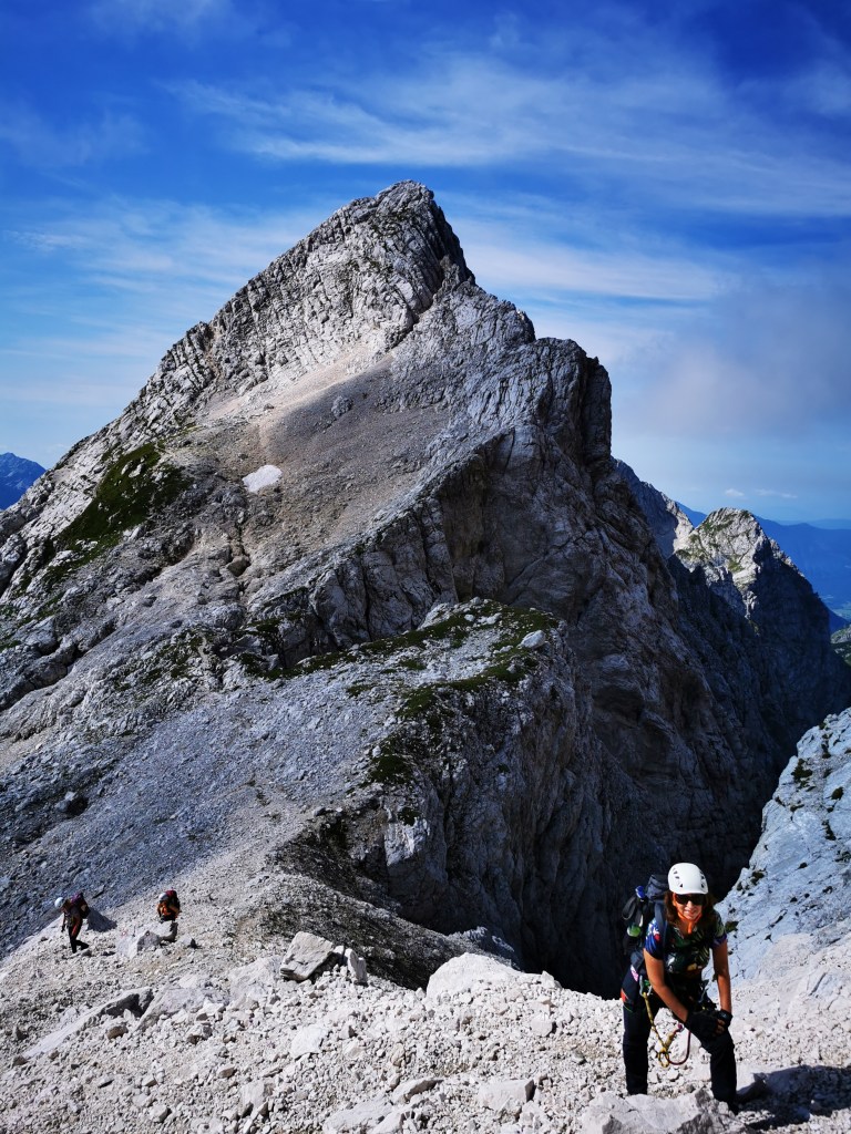 Iza nas ostaje prepoznatljiv oblik kristala – vrh Jalovca kakav se nalazi na grbu planinarskog saveza Slovenije. Nismo još ni blizu na sigurnom, još se spuštamo gotovo tisuću metara niže, i još tu ima dramatičnih strmina do doline Tamar.