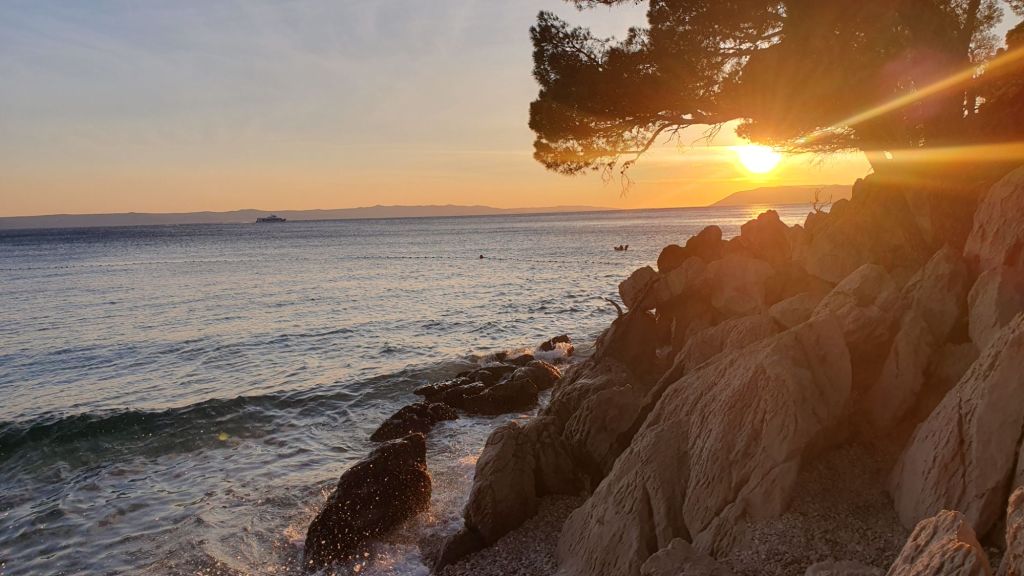 Prvi put smo u Tučepima muž i ja. Savršena široka šljunčana plaža, drvored borova koji osiguravaju cjelodnevnu hladovinu onima koji to žele i dovoljno sunca drugima, a besprijekorno more još uvijek je ugodno toplo iako je kraj rujna. Uz plažu je sagrađena ugodna šetnica s dva reda ugostiteljskih objekata, znači sve što čovjeku na odmoru treba. Iza restorana diskretno stoje mnogobrojni hoteli. Kako li je ovdje u sezoni? Na horizontu ispred nas Brač i Hvar, a iza sive stijene Biokova.