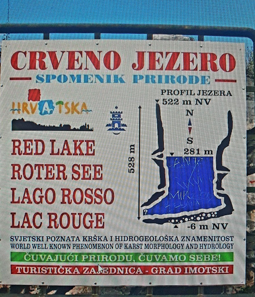 Vidi se s ceste, ali ne to nikako ne bi zadovoljilo moje potrebe. Parkiramo se dalje na parkiralištu, sagrađenom za prilaz jezeru i izlazimo na još užarenije područje na rubu šume. Lako dolazimo šumskom stazom do samog ruba, gdje tla nestaje, a tek se negdje duboko dolje vidi vodena površina. Wow! Jasno je da je ime dobilo po crvenim stijenama koje ga okružuju. Uz rub je postavljeno uže kao opomena da ne idemo bliže.