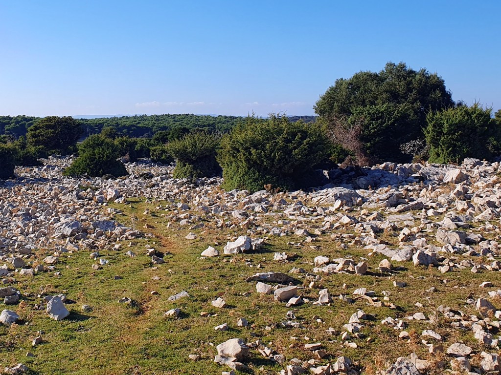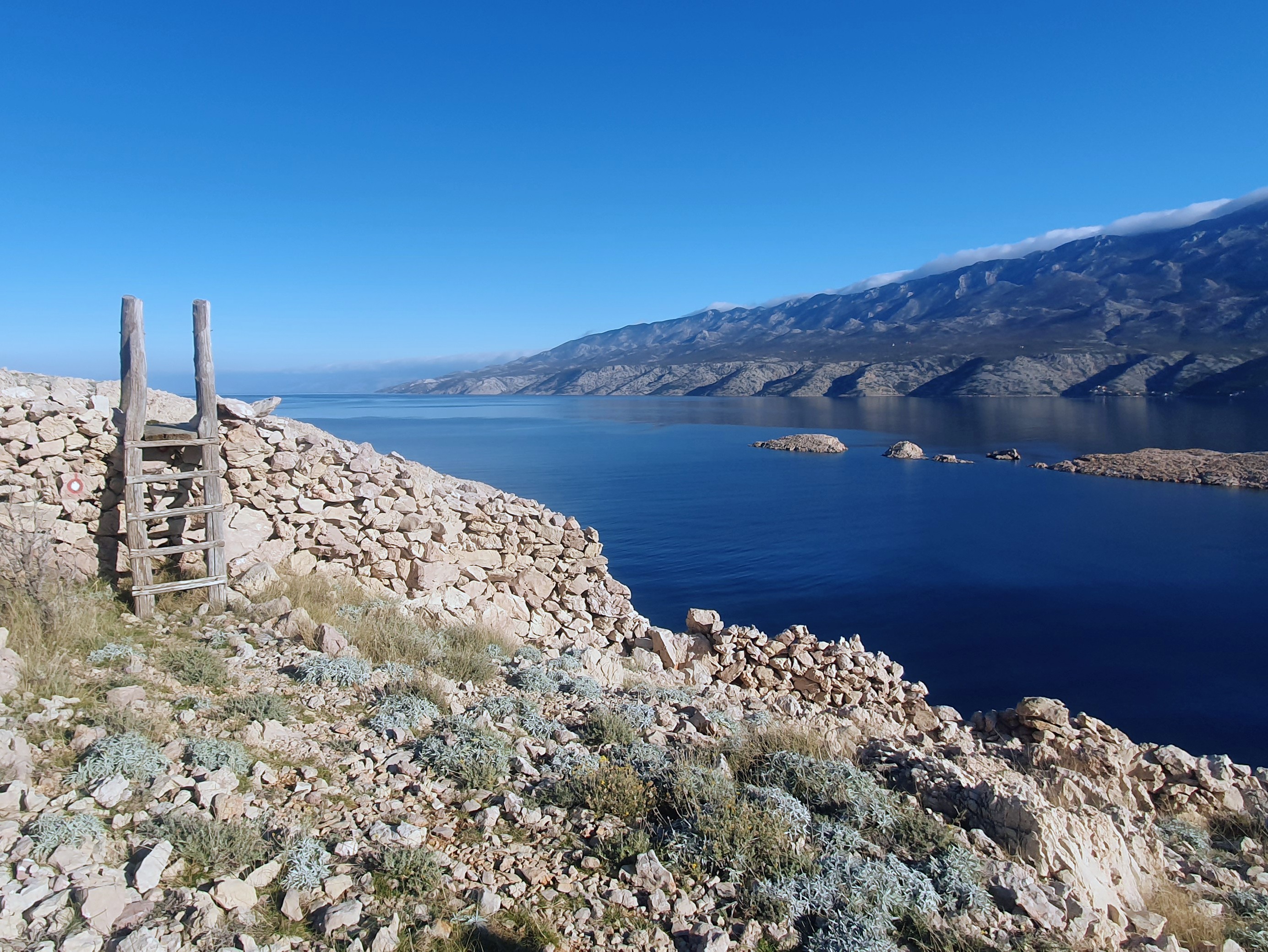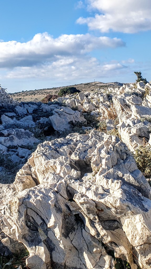 10:30 Idemo dalje. Nastavljamo gdje smo jučer stali prema Loparu stazom koju su trasirali vrijedni članovi PD Kamenjak kroz škrape i kamenjar. Građena od kamenih gromada, gruba i opaka, vodi nas pored postojanih suhozida s lijeve strane, a strmih klisura iznad mora zdesna – znači atraktivna.
