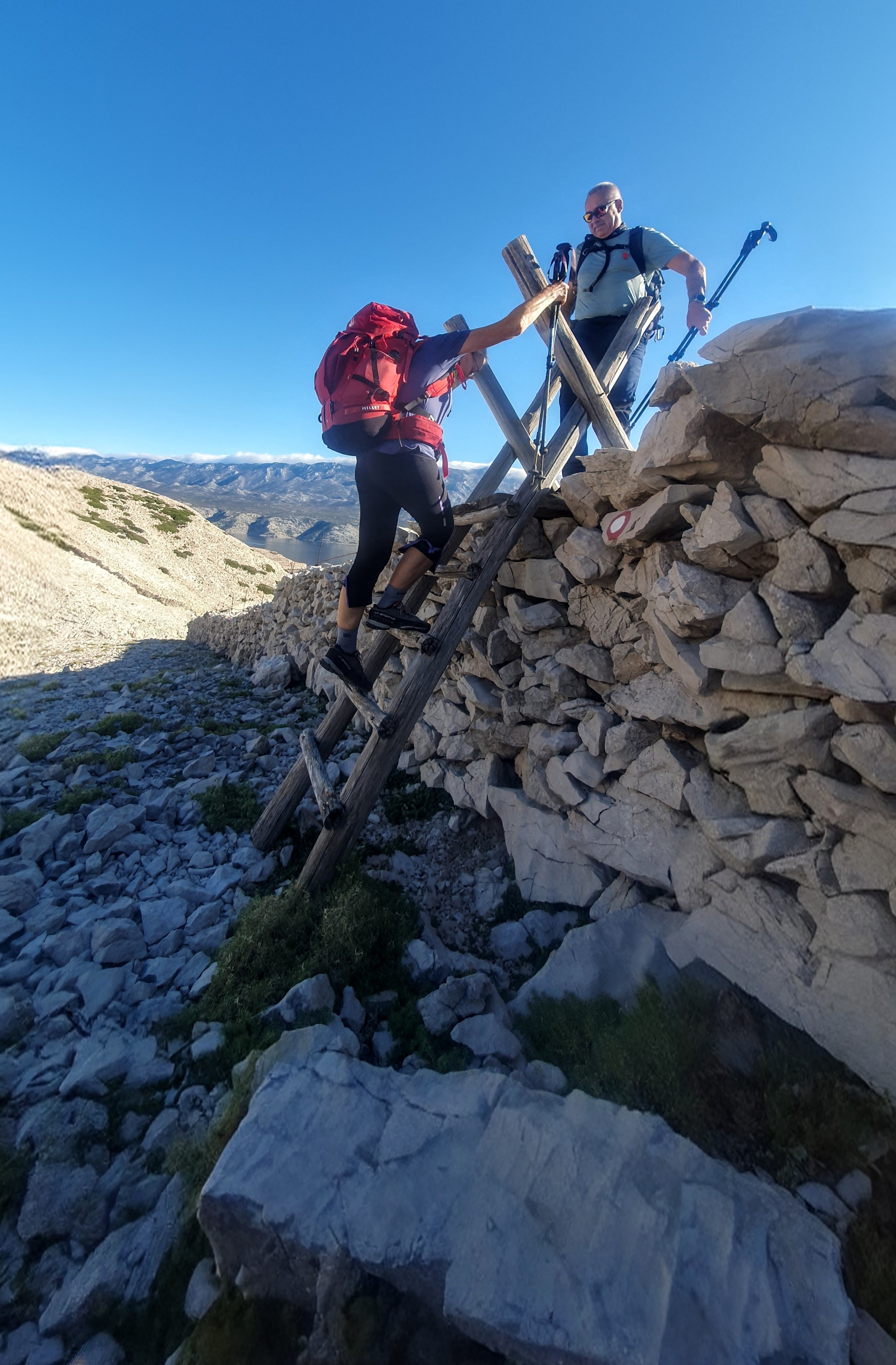 Vrijeme je iznad svih očekivanja, 16 C uz besprijekorno plavo nebo. Kad pomislimo da je pretoplo, dobijemo blagi povjetarac, a kad pomislimo da se staza opustila tu su ljestve da nas zabave.