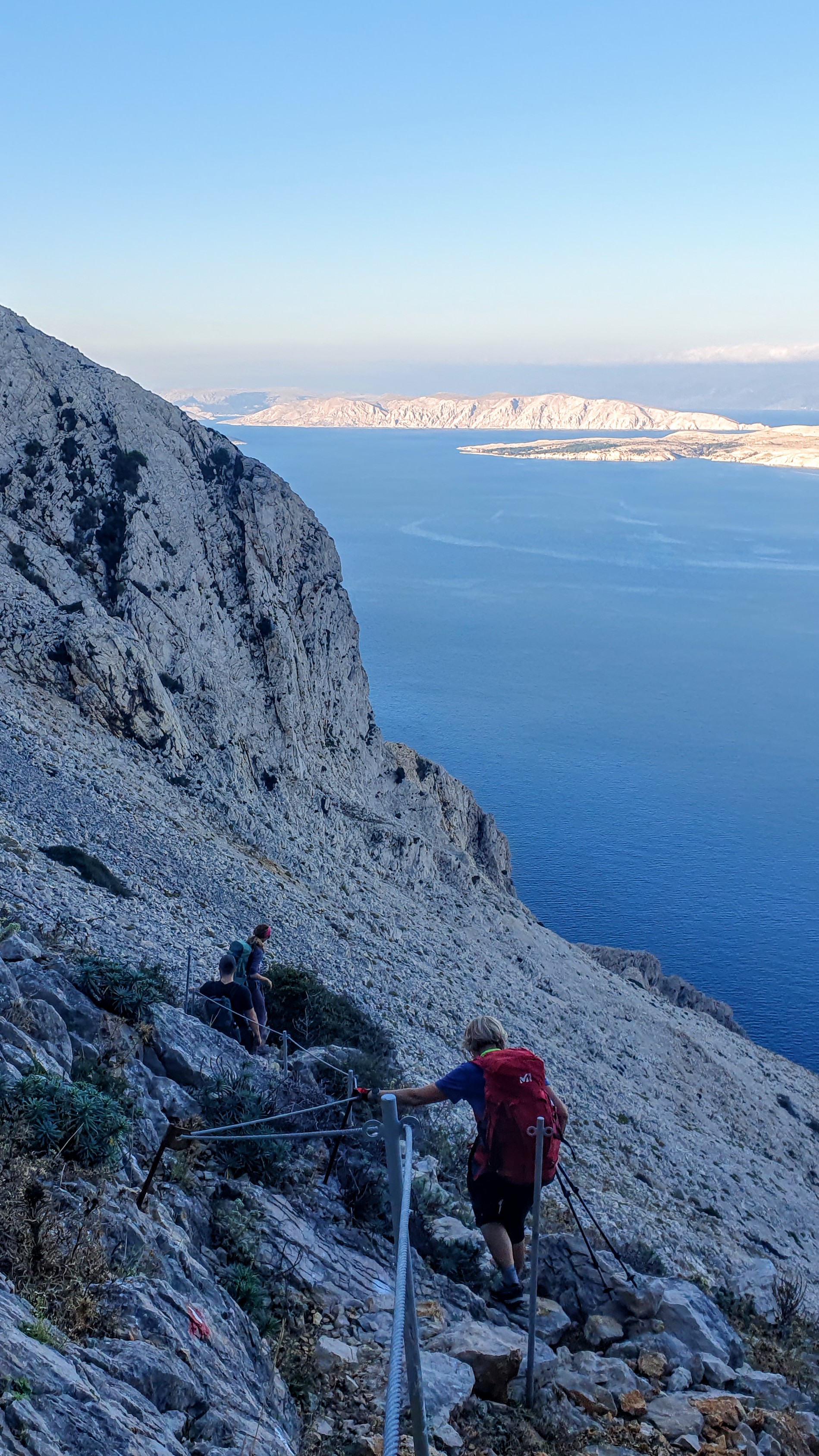 Nadalje se staza magično penje na crvene stijene i daje uvid u nova spuštanja i penjanja po grubom stijenju dvadesetak metara okomito iznad mora. Svaki je korak dobro odmjeren i oprezan baš kao u Alpama, baš kao uvijek, samo što ovdje imamo privilegiju gledati plavi Jadran, ma, najplaviji.