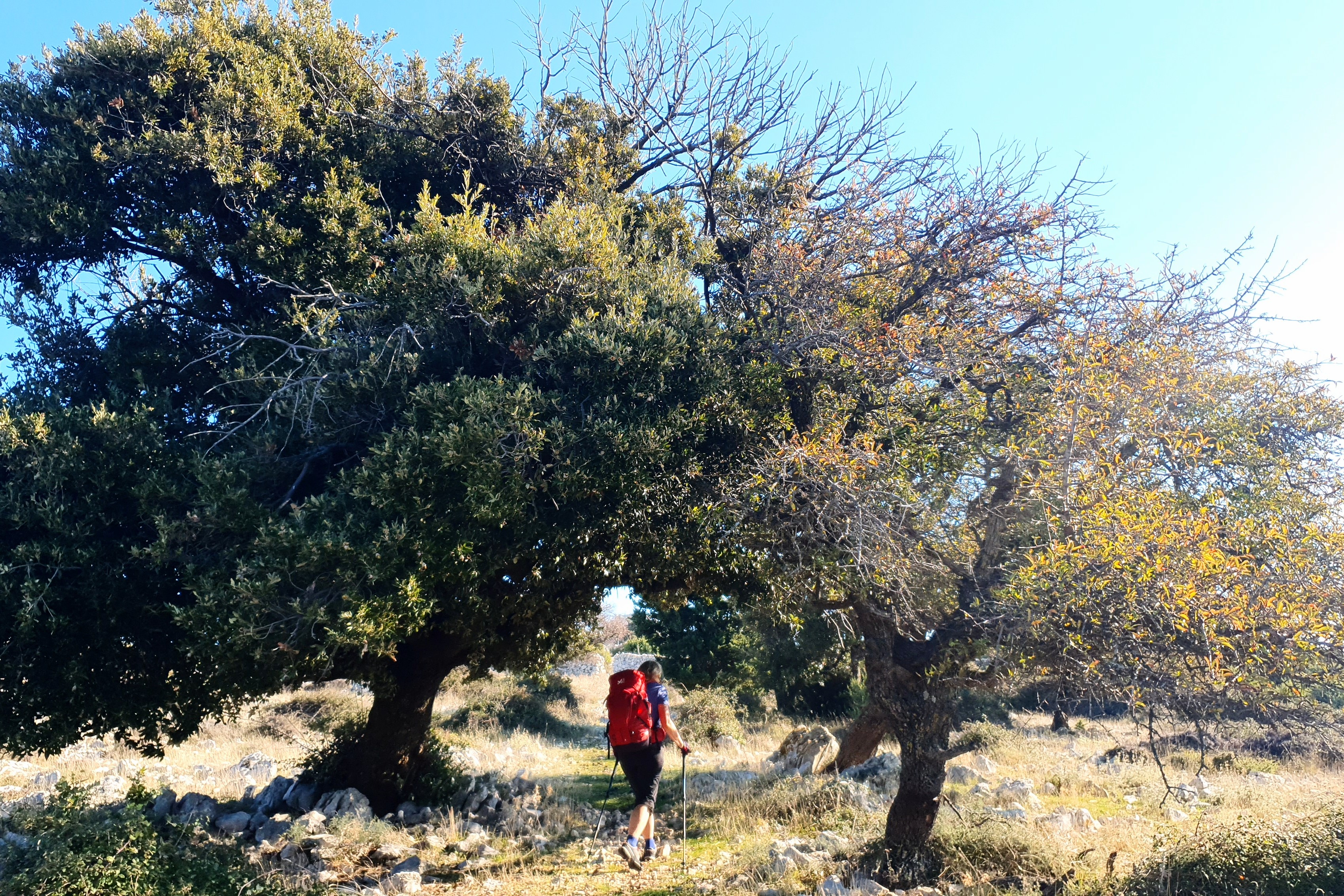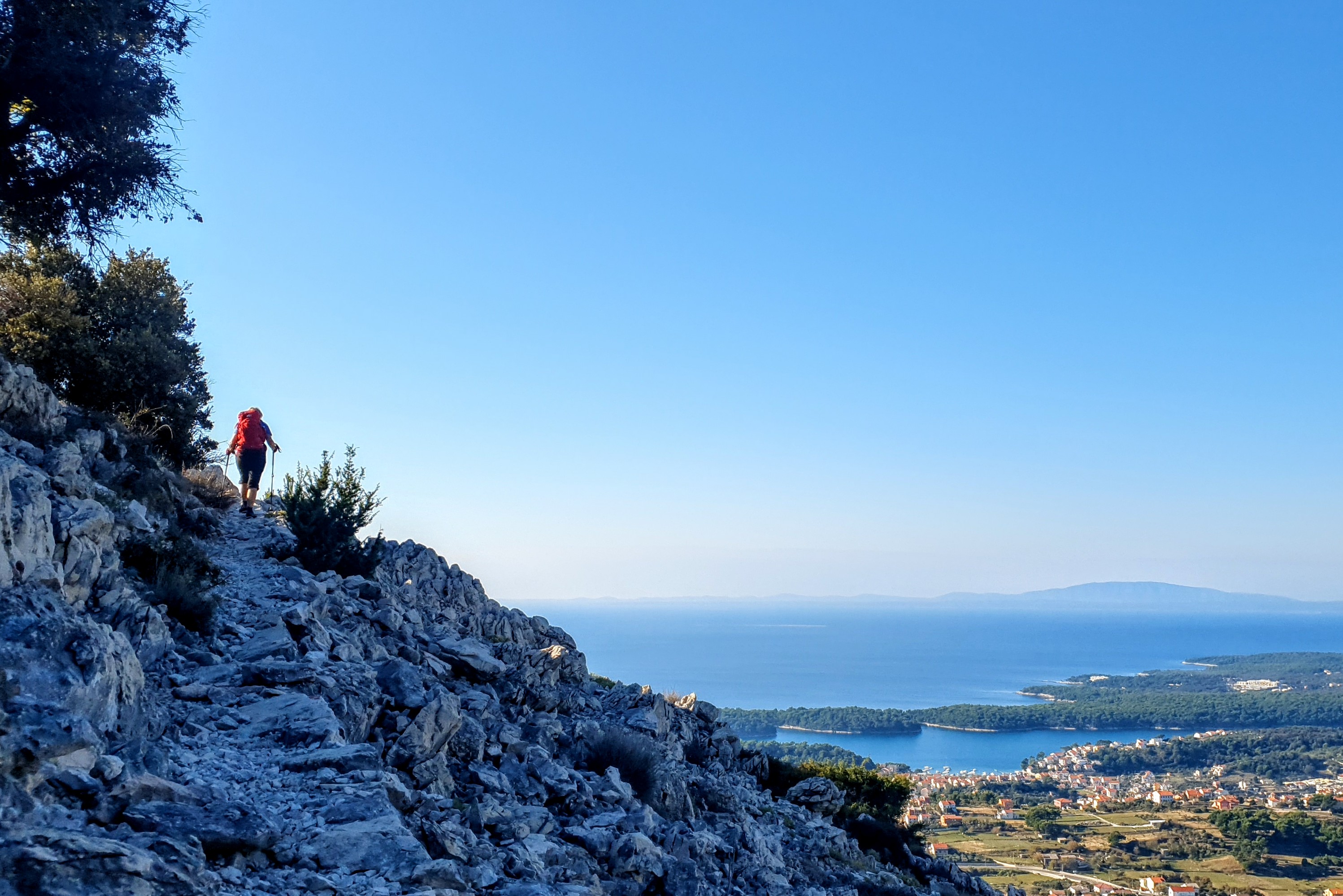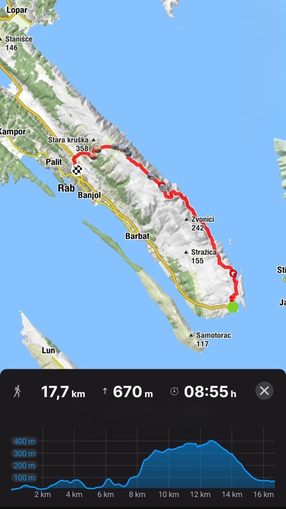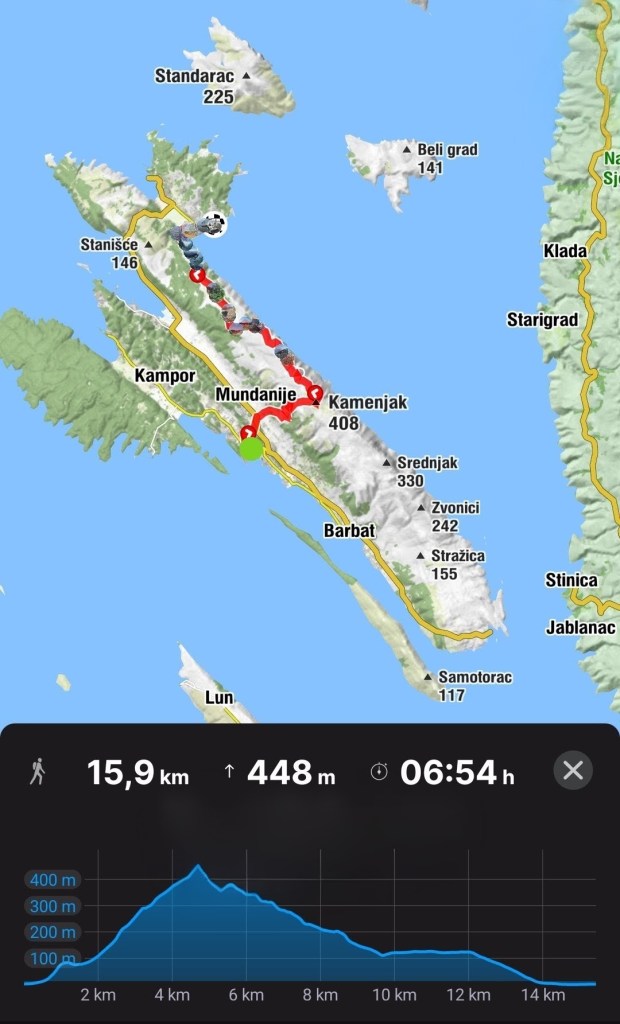 8:30 S mobitelom u ruci kao nekad oni što su s rašljama i viskom tražili vodu, hodam amo tamo tražeći stazu dok nismo malo odmakli od obale, tek tad sam uhvatila smjer. Jutro sunčano, nebo bez oblačka – fantazija.