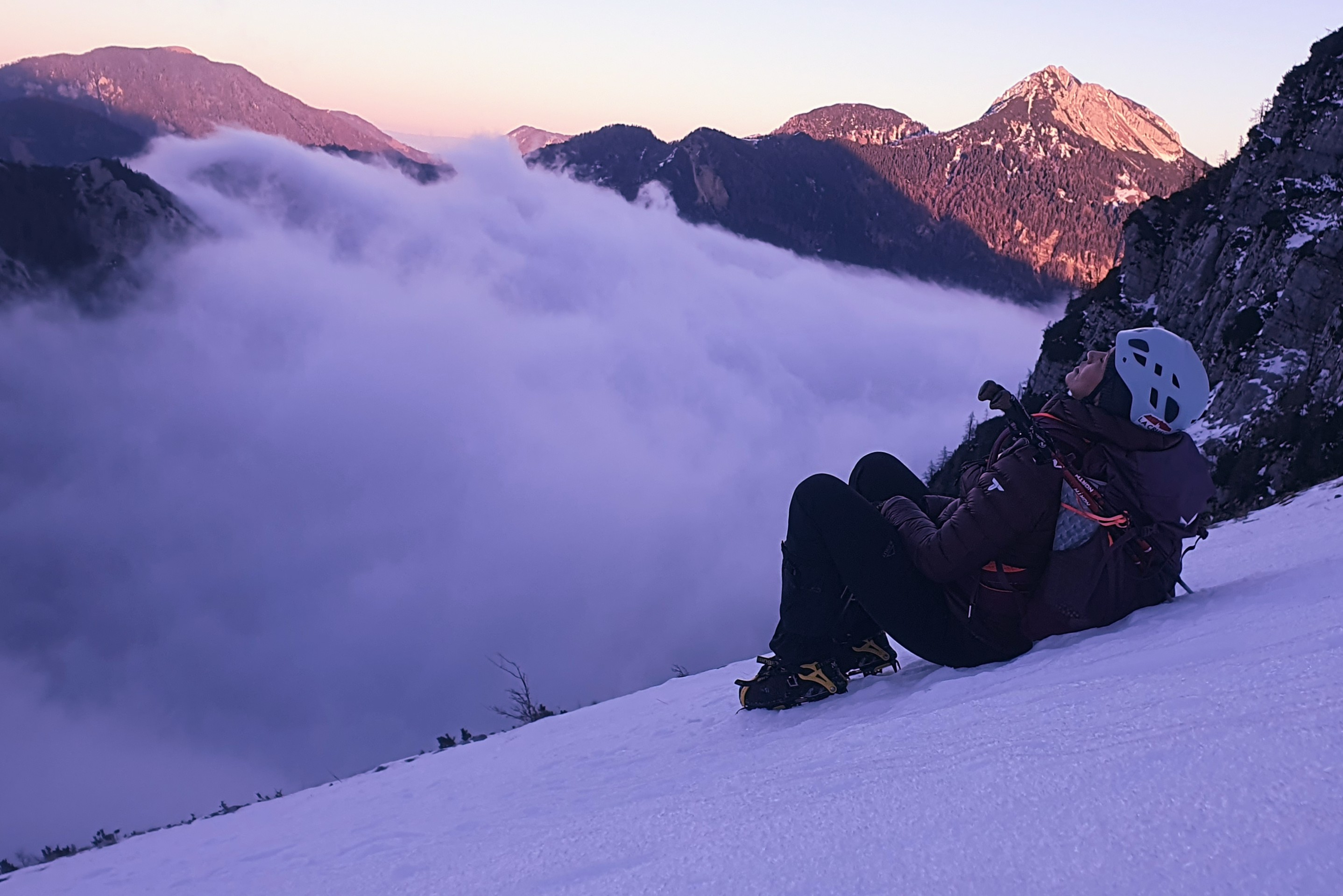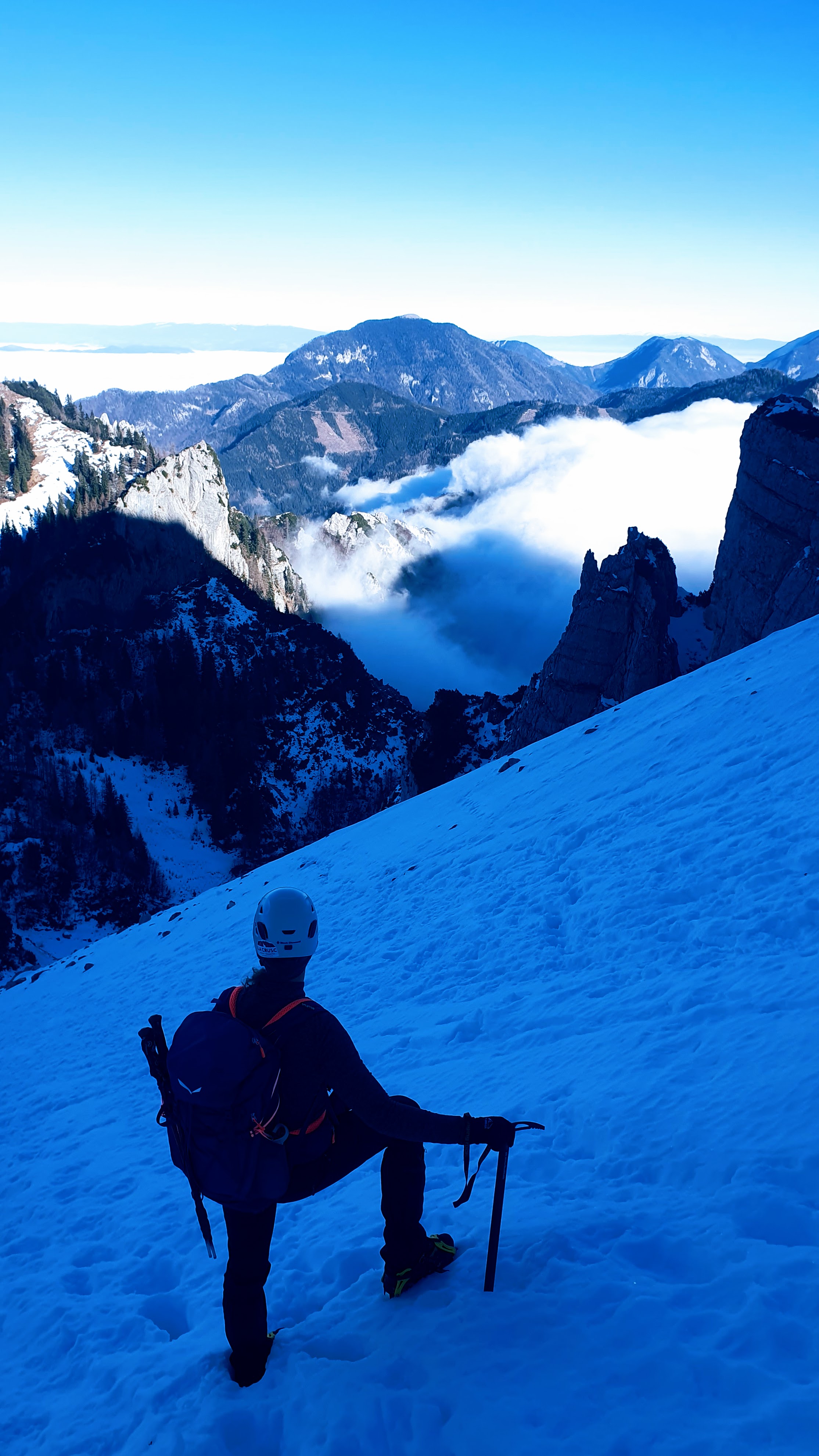 Pored nas oštre stijene, pod nogama čvrsti snijeg i koncentracija. Ne smije se ovdje pogriješiti, poskliznuti, popiknuti, zapeti derezom, niti išta drugo, ali se smije stati, čak sjesti, zaustaviti zvuk škripe snijega pod metalnim klinovima, osjetiti blizinu neba ljubičastog od sunca na zalazu, zagledati se duboko u tišinu, u sebe i samo biti – biti sretan.