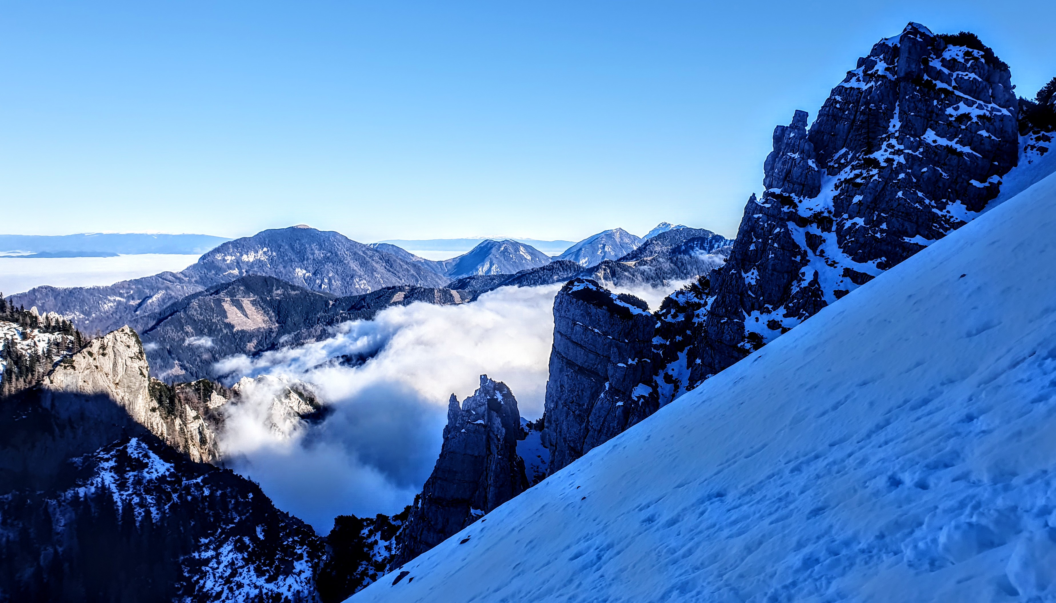 Polazimo na planinarsku turu iz mjesta Podljubelj blizu austrijske granice. Ruksaci su teški zbog zimske opreme, a očekivano gusta magla odvaja nas i čuva. Penjemo se. Zavjesa oblaka se lagano povlaći, otkriva uspavanu stijenu i pokazuje da još negdje sunca ima.