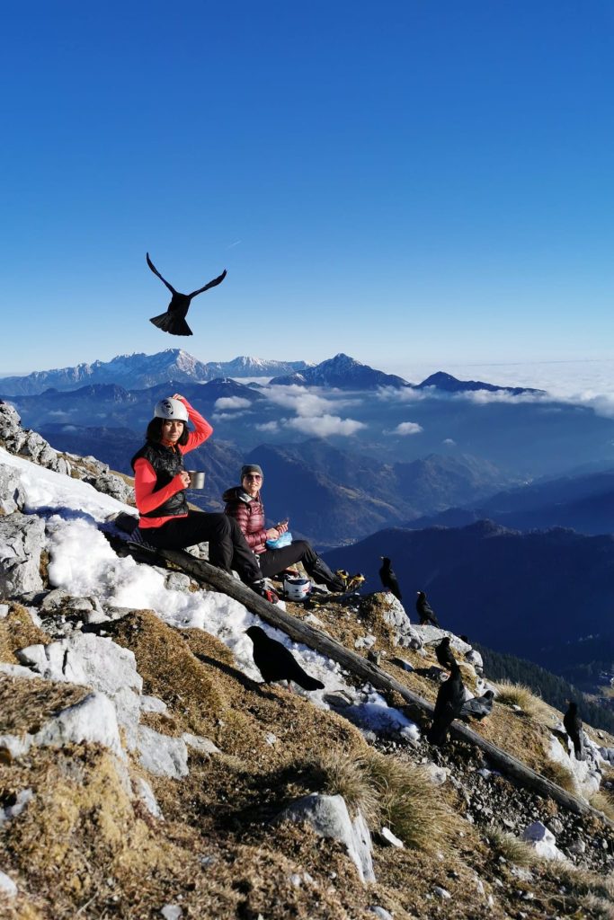 Bacamo ruksake, ne znamo što bismo prije – sjeli da odmorimo, pojeli sve što imamo, jer umiremo od gladi nakon 3 h 40 min uspona, a treba i poneku fotku napraviti. “Cure, a da ja vama prvo skuham kavu!”, rješava dilemu Dražen i vadi plinsko kuhalo.