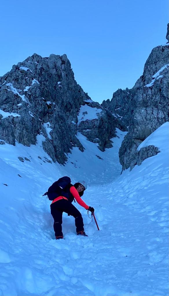 Zamka (uže duljine 6 m) i dva karabinera moraju uvijek biti u svakom planinarskom ruksaku zbog situacije kao ova. Dražen se usidrio, dobacio uže s karabinerom, zakopčala smo ga za pojas ruksaka i tako dobila barem na osjećaju sigurnosti, te se popela ledenim dijelom u kombinaciji sa stijenom bez pravog oprimka i nastavila dalje.