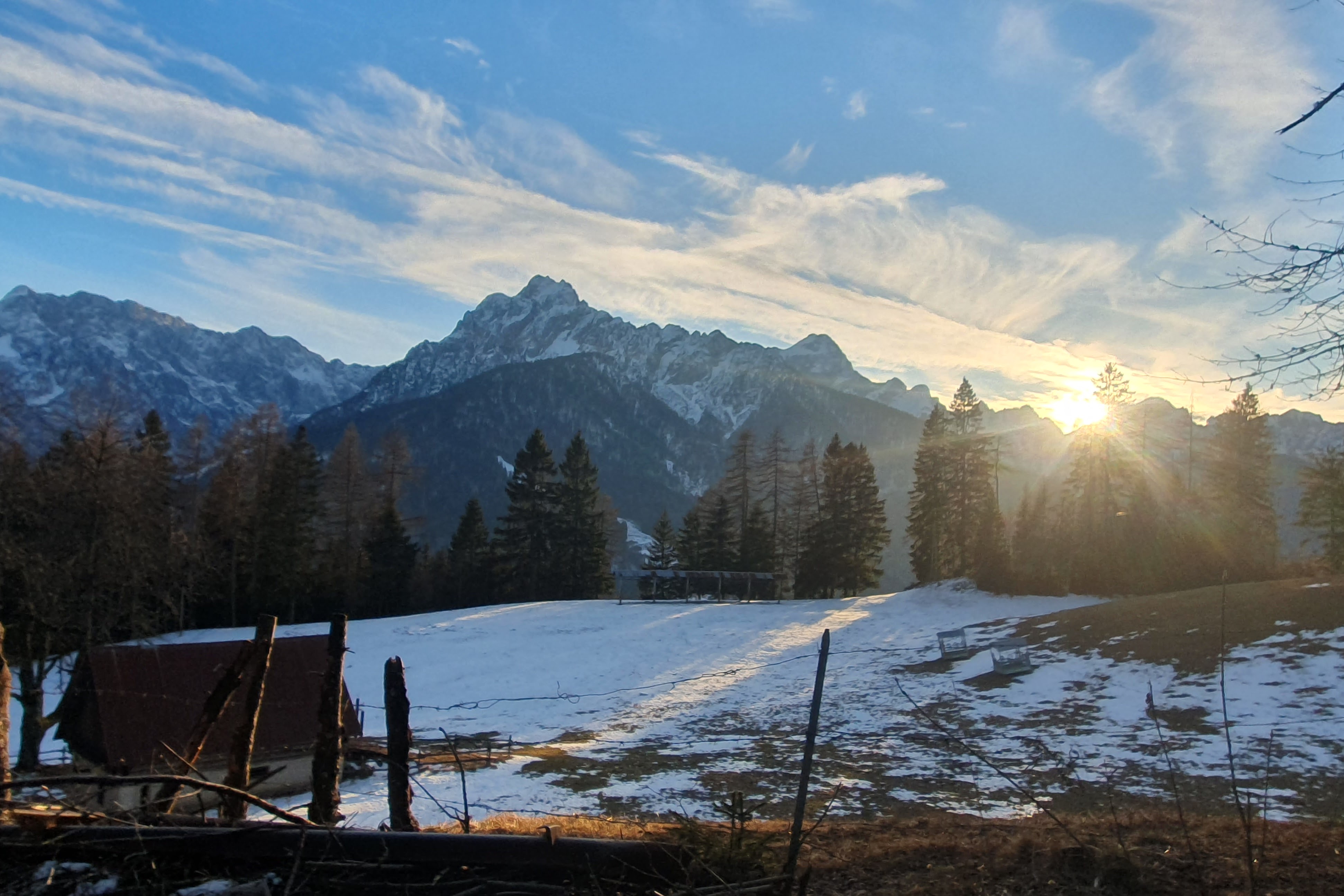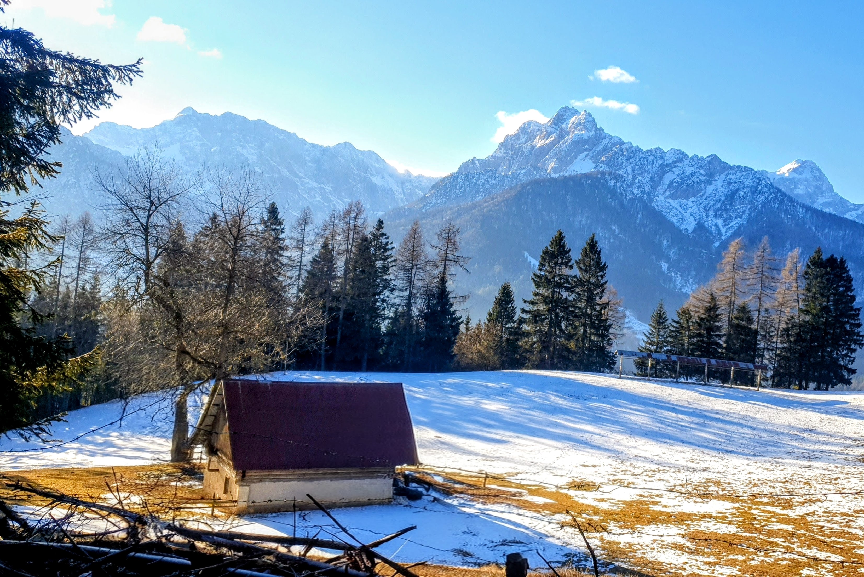 Trošimo čvrste zimske gojze po grubom kamenju kolnog puta na granici s Italijom, malo se okrenemo da preko pitomog pašnjaka bacimo oko na moćne talijanske vrhove Julijskih Alpa i nastavljamo. Sada idemo serpentinastom stazom, po isprepletenom korijenju crnogorice, gdje se iza svakog zavoja otvara zadivljujuć pogled. Tu je i sunce, suhi travnati proplanak i glad. “Ajmo malo sjesti, baš je prekrasno mjesto!”, govorim i bacam ruksak. Najbolje mjesto za objed je onda kad si gladan.