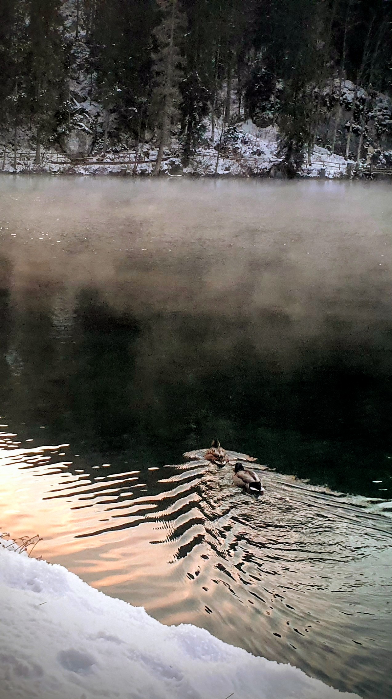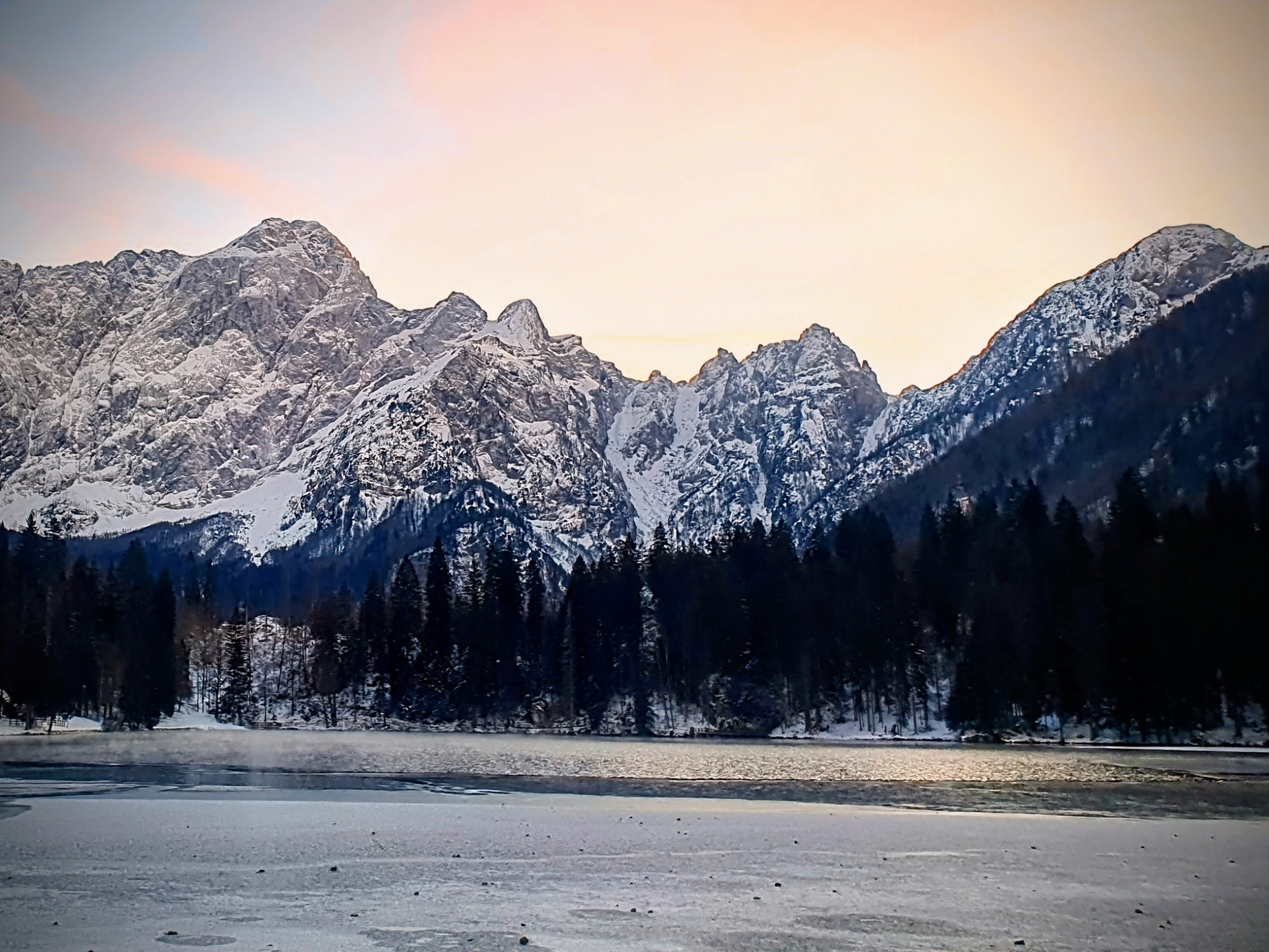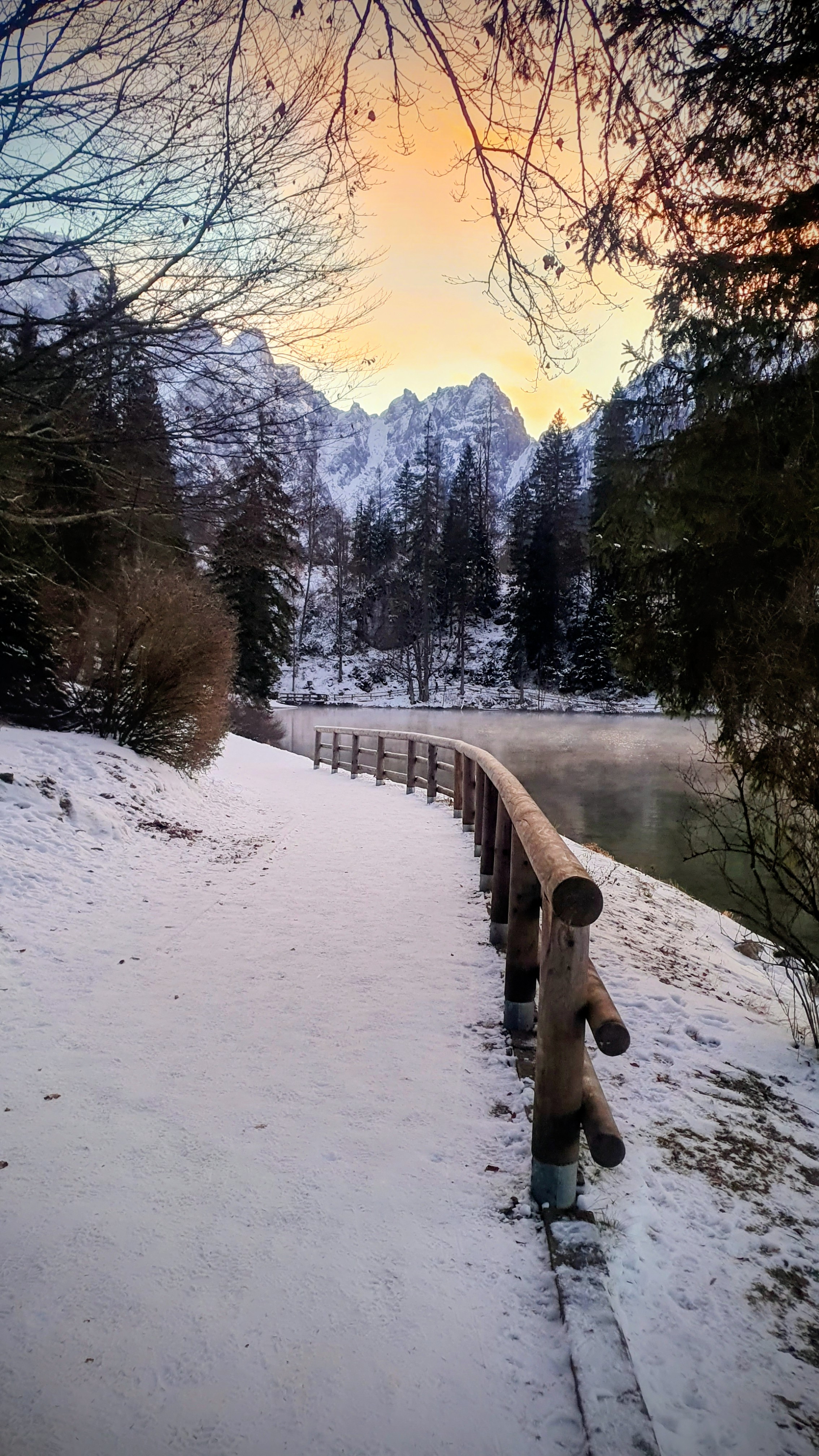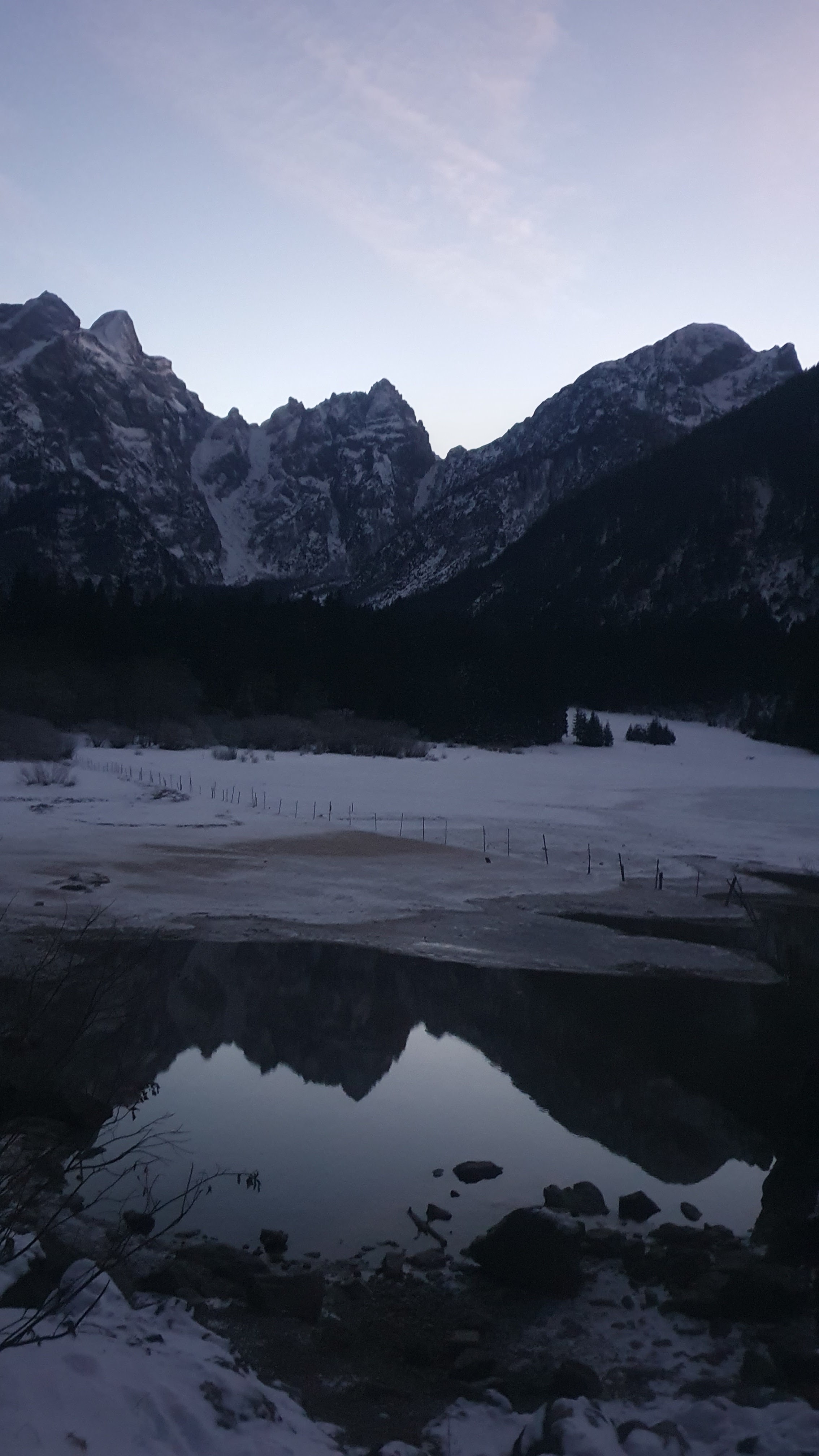 16:00 Sunce je na zalazu, a mi žurimo u aute i za desetak minuta hodamo po zaleđenoj stazi oko Belopeških jezera podno Mangarta, kako ih zovu Slovenci ili Laghi di Fussine, kako ih zovu Talijani. Površinu jezera uglavnom prekriva led, stoga nema odraza stijena, što je glavni adut ovog, a i svakog drugog jezera. “Gdje su sad patkice?”, pitam i samo što sam to izgovorila, ulaze u vodu, baš ispred mene. Wow! Sad bih rado da sam umjesto Monte Coppe odabrala doći ranije ovdje. Ah…