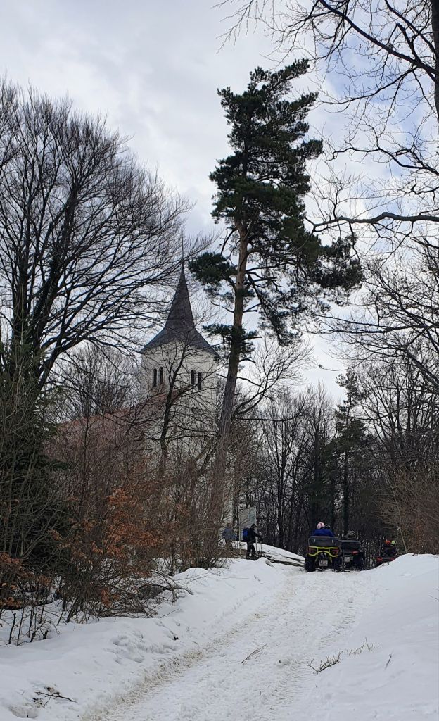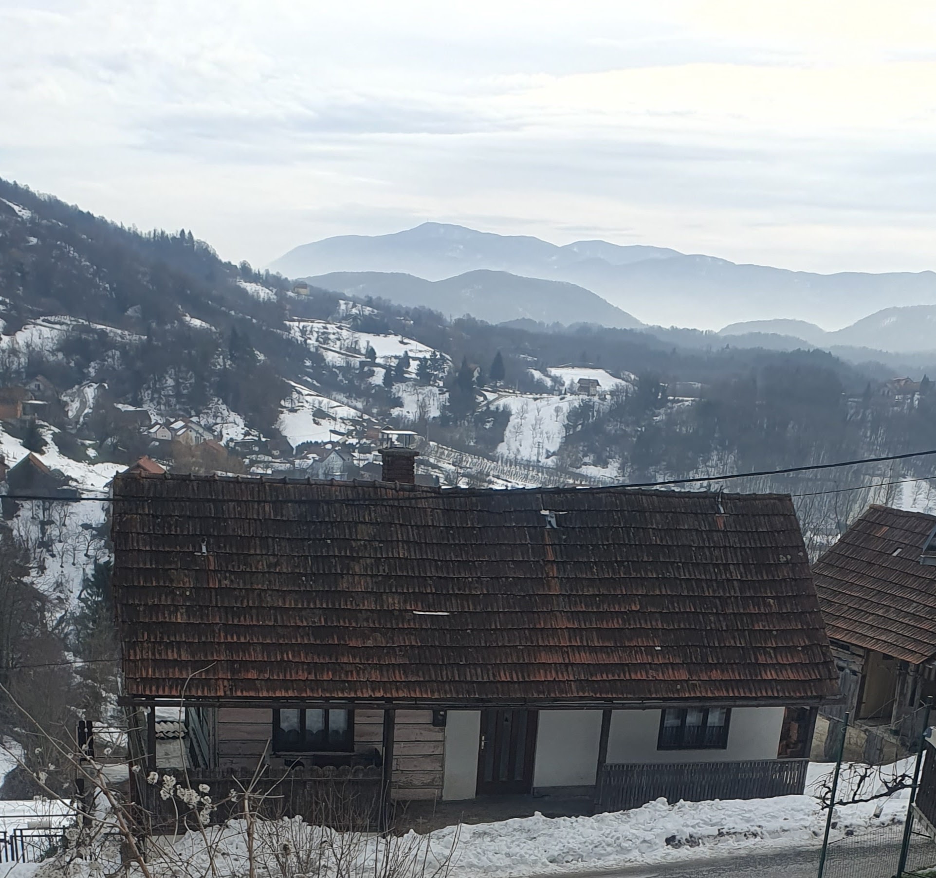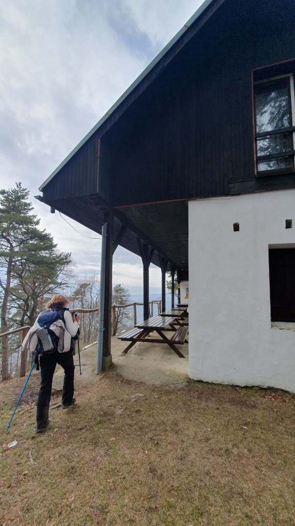 Planinarska kuća Pusti duh na 672 mnv zimi nije otvorena, ali nudi klupe za predah i neograničen pogled preko Strahinjščice na Sloveniju.