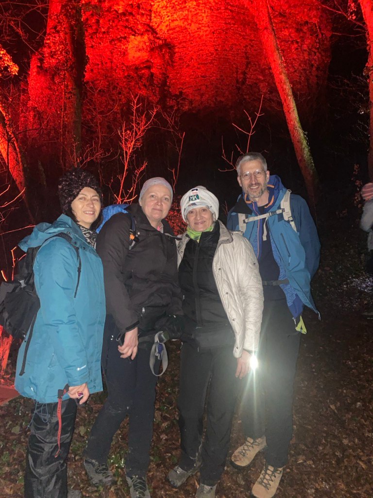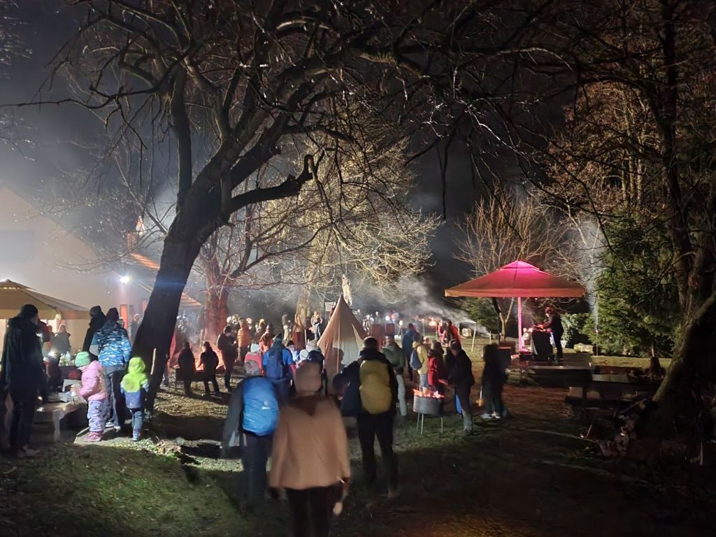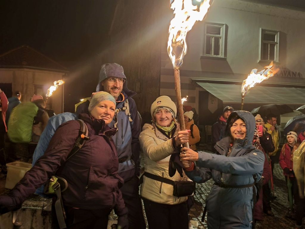 Palimo baklje i lagano formiramo kolonu u smjeru Cesargrada, koji se nalazi na obližnjoj Cesargradskoj gori (508 m). Puno je obitelji s malom djecom. Lijepo ih je vidjeti. Za njih je organizator pripremio kraće baklje. Asfaltiranu cestu smjenjuje makadam iznad vinograda. Ulazimo u šumu. S vremena na vrijeme zaori se: “Buna!”, a mi kmeti odgovaramo: “Traje!” i za sat vremena smo na platou ispred planinarske kuće Cesargrad. Puno je vatre ovdje. Neka je za rasvjetu, neka za grijanje, a tu su i vatrene plesačice – dvije mlade dame koje izvode ples s vatrom uz prigodnu glazbu. Izvrsne su!
