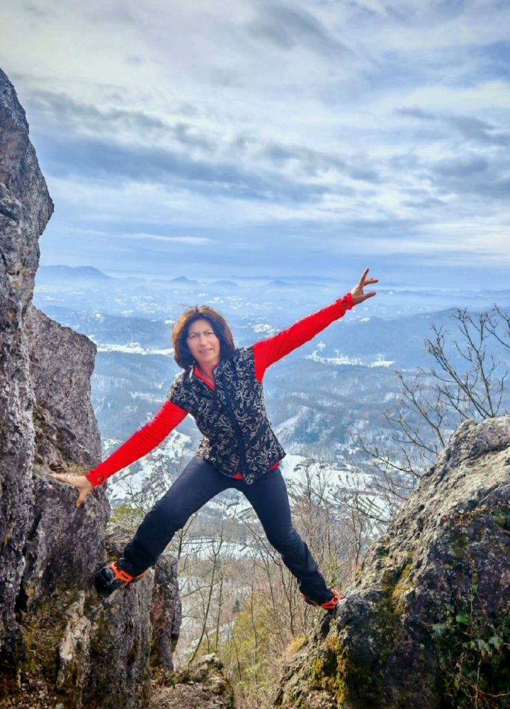 Slijedi sam vrh Ravne gore, stijena u šumi bez vidika s izgrađenom piramidom. Ne penjemo se okomicom od jedanaest metara, već se zadovoljavamo pogledom u podnožju, a Sandra nam skreće pažnju na fotogeničnu foto točku između dviju stijena.