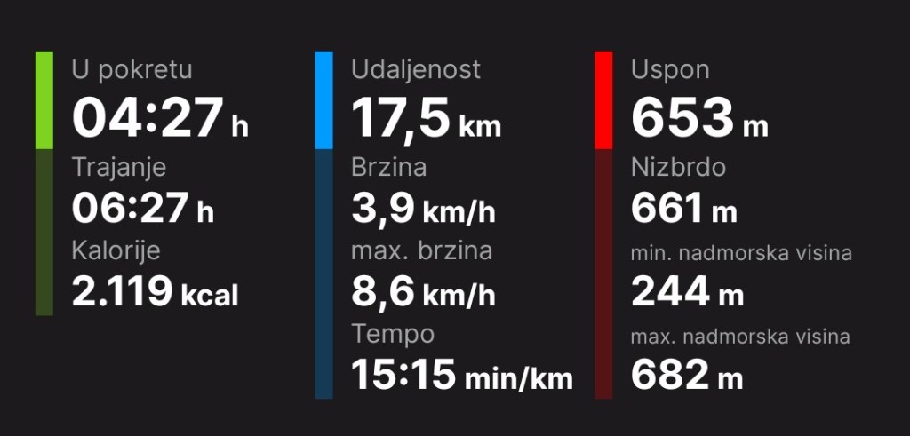 Spuštamo se drugom strmom kamenom stazom. Sklisko je malo zbog snijega, malo zbog blata. Tu se može skrenuti lijevo i dodatno zabaviti sajlama i klinovima, ali nama je dovoljno sklisko/uzbudljivo ovako. Nadalje smo na asfaltiranoj cesti i nisam baš ponosna na taj izbor, ali zahvaljujući tome dolazimo do auta s tek prvim kapima kiše. Da, počinje kišiti, baš kako je prognoza predvidjela.