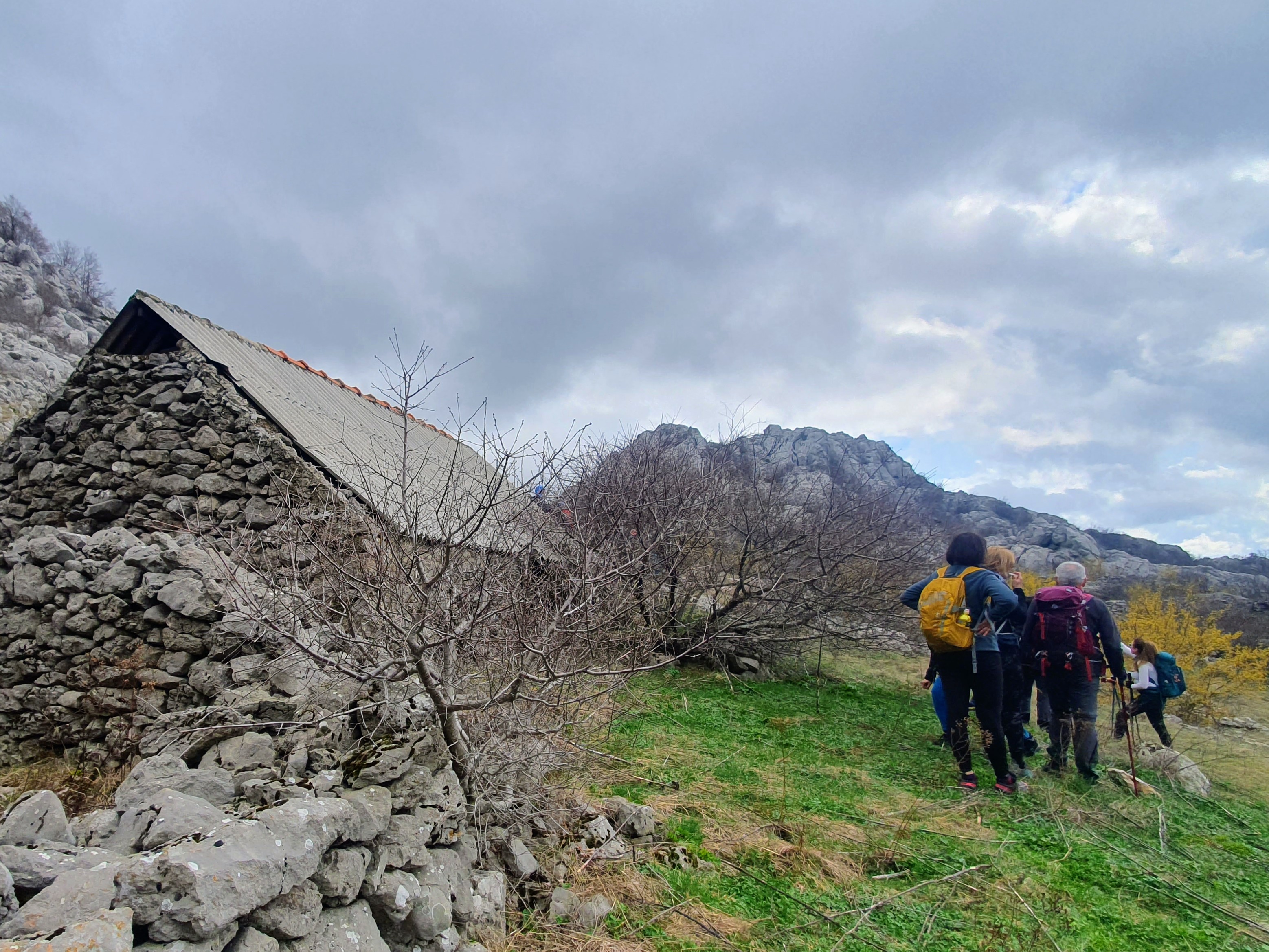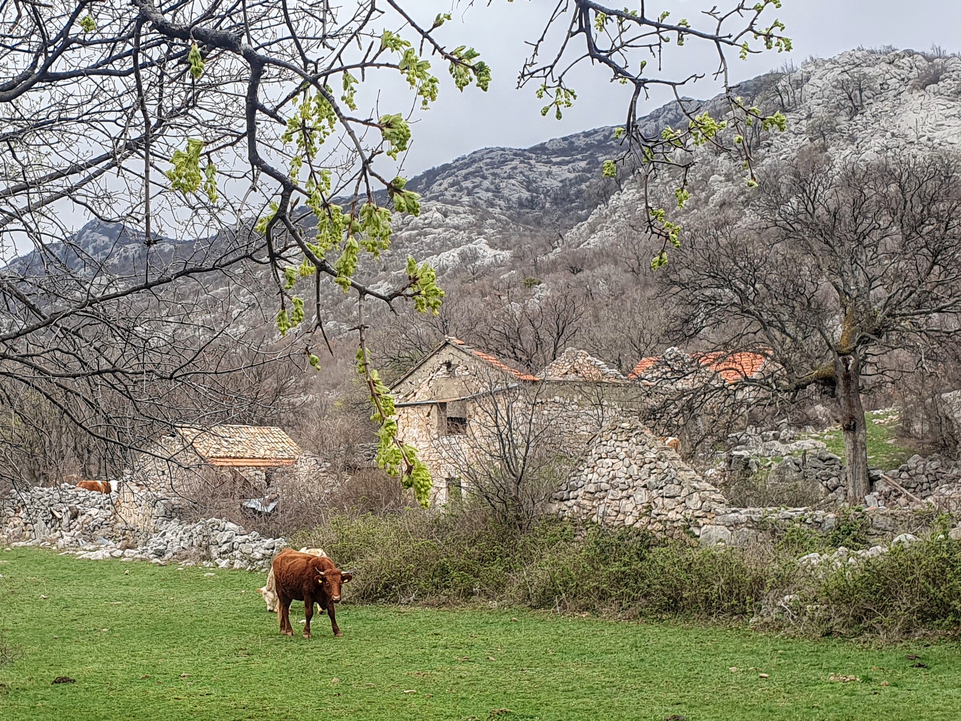 Za zagrijavanje imamo dva kilometra strmog makadama, koje prekidamo razgledavanjem živopisnih kamenih kuća napuštenog sela, kakvih je mnogo u bespuću Velebita, jer u Velebitu se nekad živjelo, obrađivala su se polja i uzgajala stoka. Ispred njih na livadi i sad pasu krave, dolje iz Pećina. Da, baš prave kravice, smeđe i šarene, velikih blagih okica.