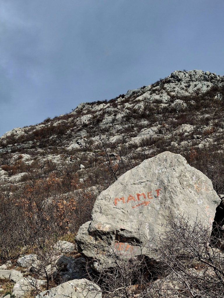 Ubrzo skrećemo na prirodnu stazu kod velikog kamena s natpisom, koji nas usmjerava prema poznatoj jami Mamet i uvodi u kameno prostranstvo Vilinskih kukova.