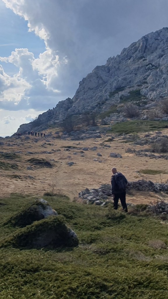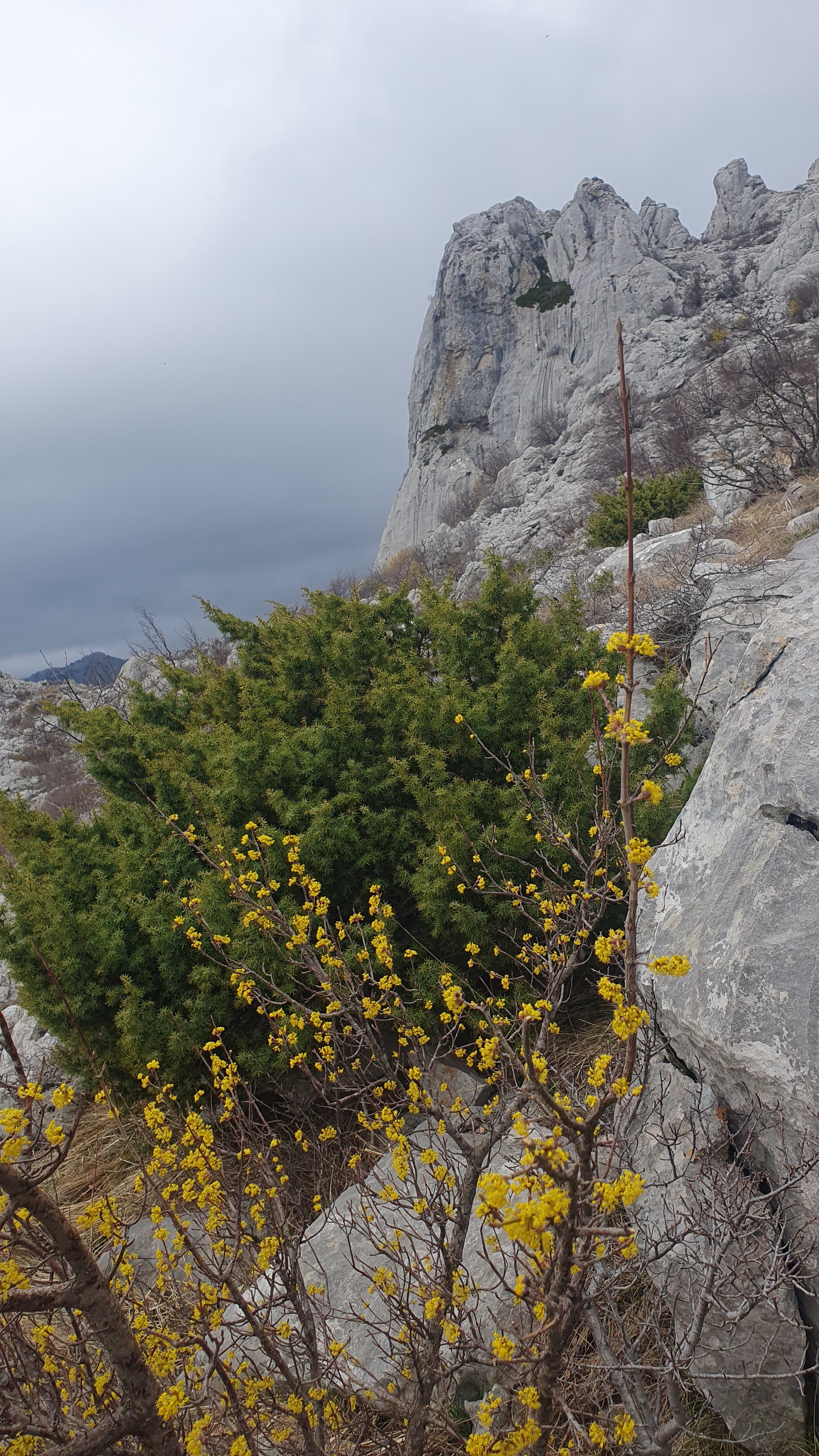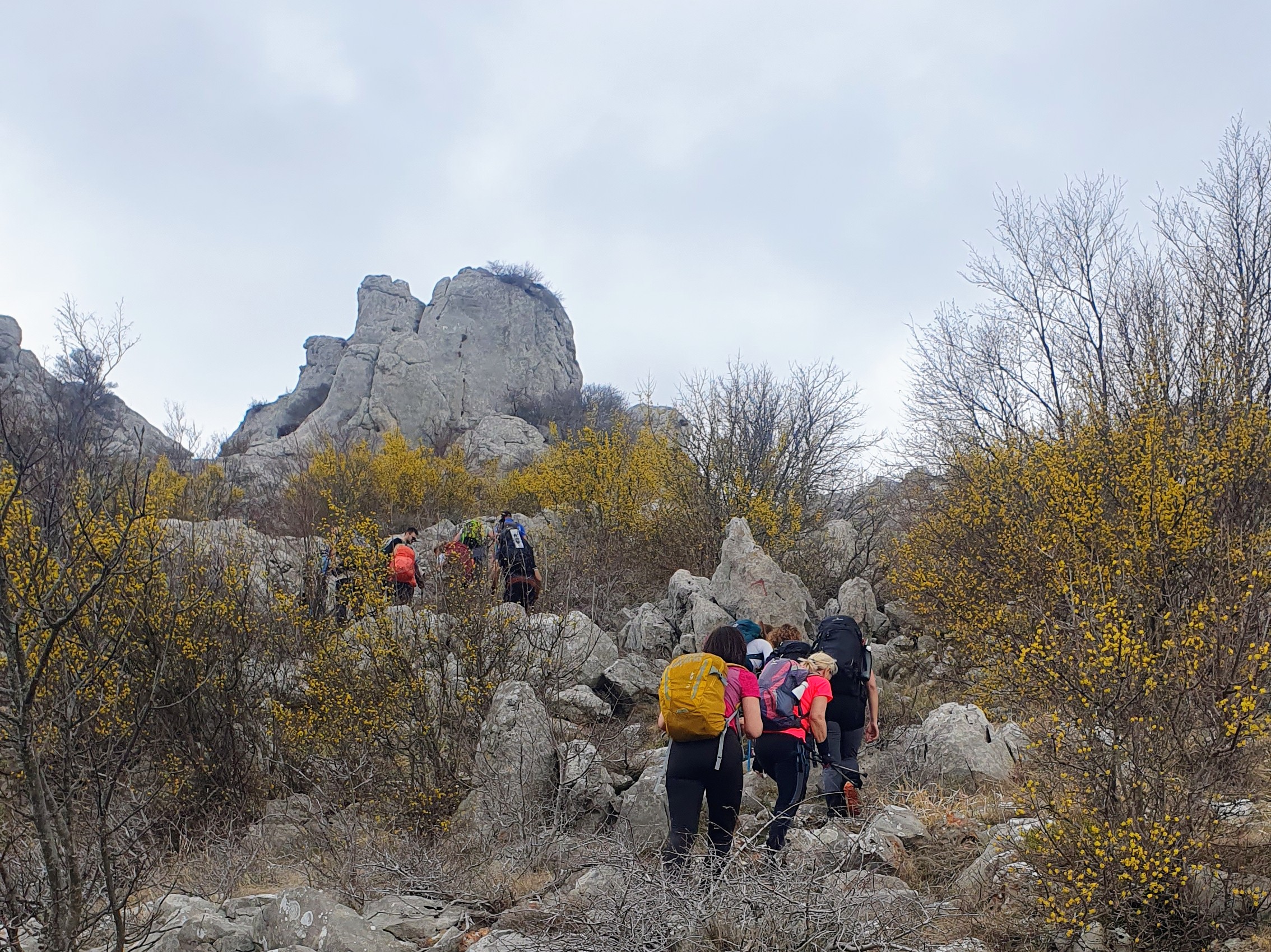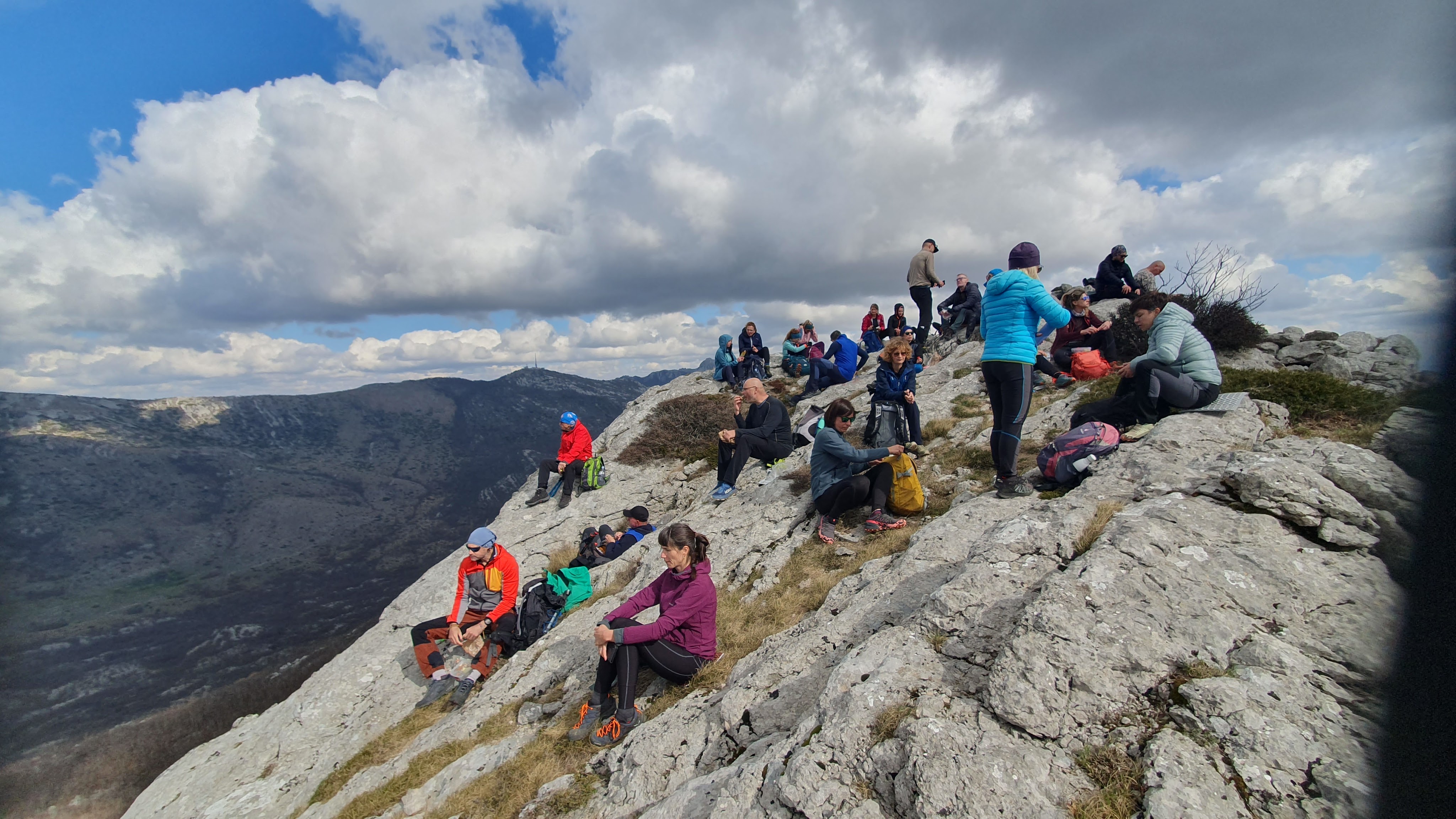 Sjedamo ispod kuka na prvu pauzu. “Je l’ se penjemo na kuk?”, pitaju neki. – “Samo malo.”, odgovara Drago. Aha. Neki su ispod, neki na stijeni, a svugdje je veselo. Velebit je danas posebno lijep. Žut od rascvalih grmova drijena, a ako znamo da je žuta boja simbol optimizma, sreće i vedrine, jasno je da sve ori od smijeha i neponovljivih fora, još samo da se razvedri.