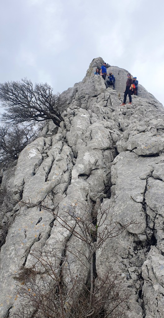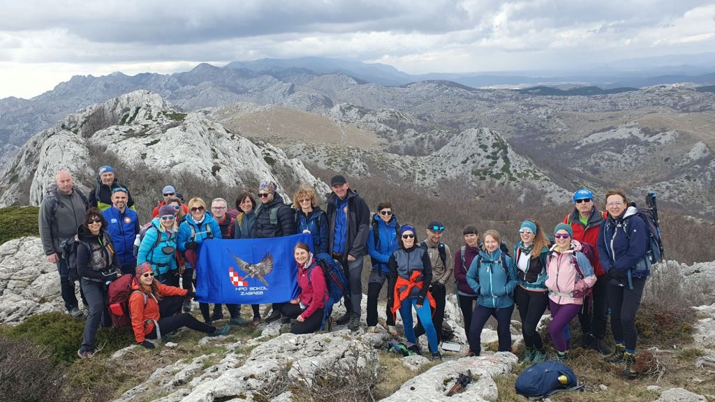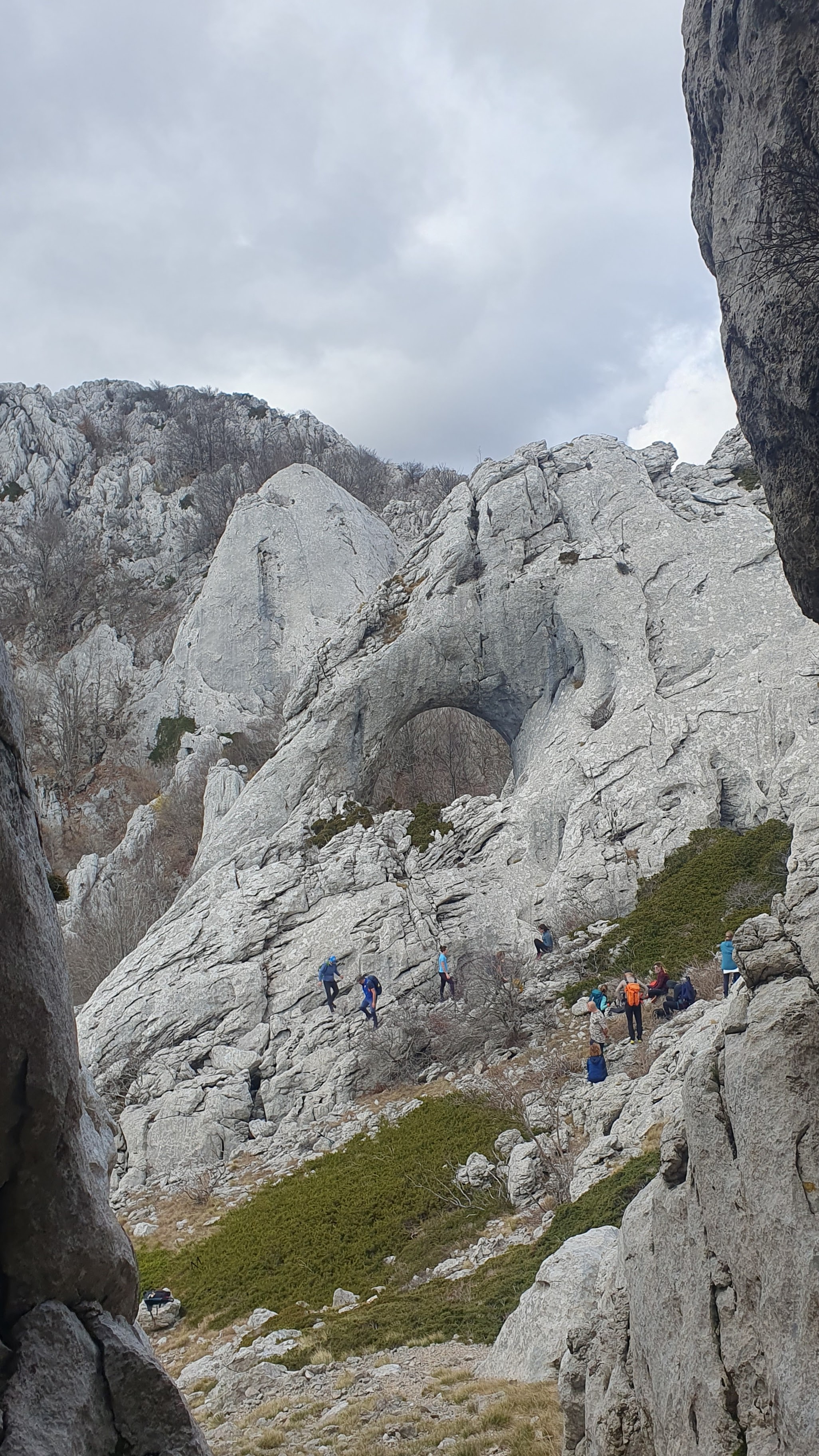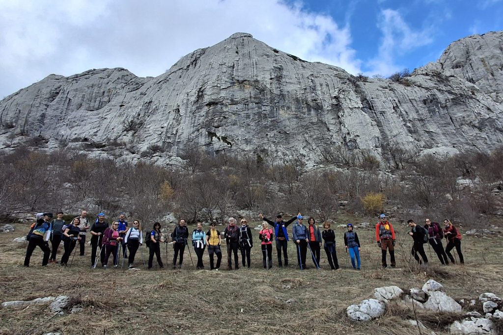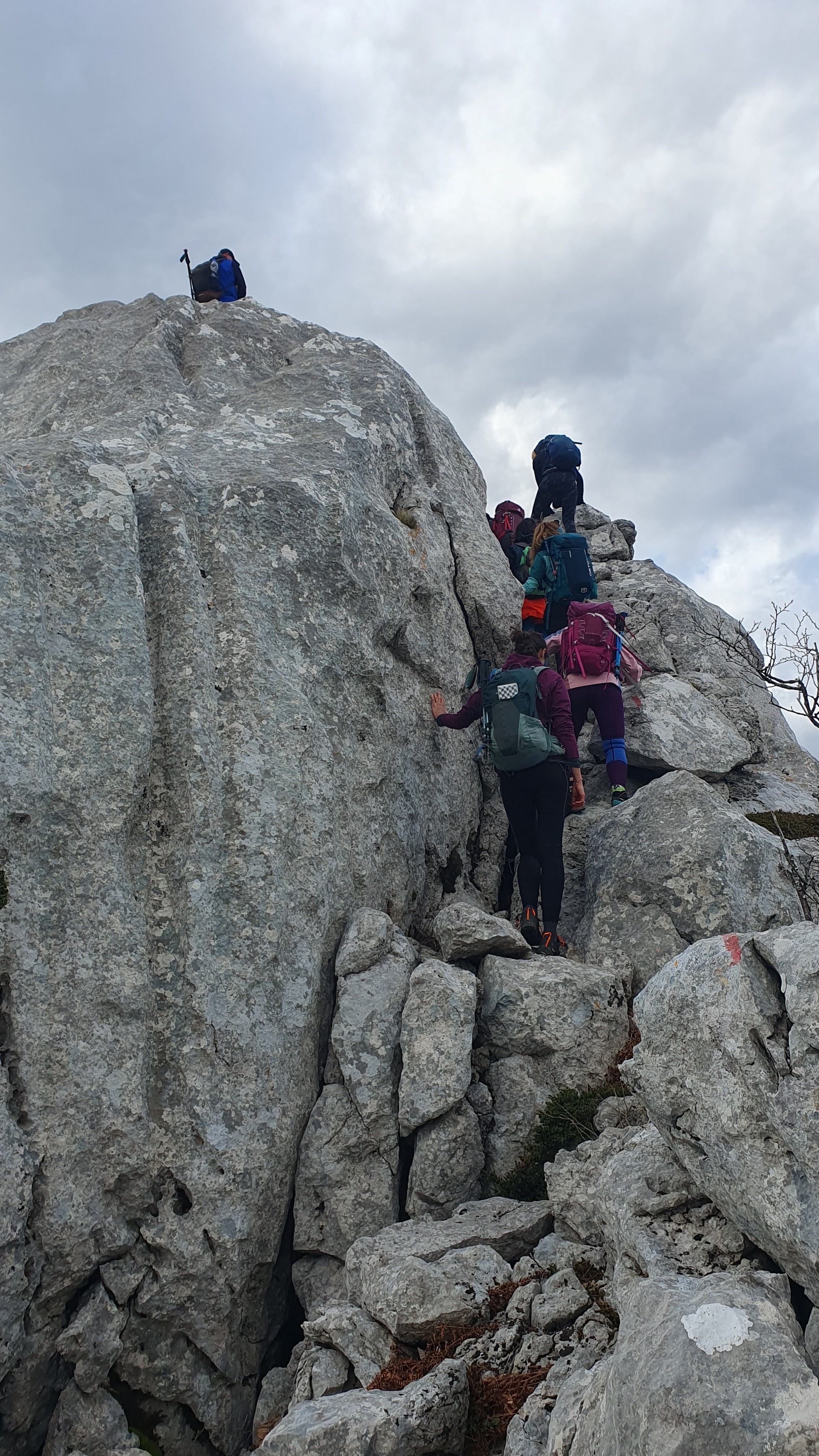 Sjedamo ispod kuka na prvu pauzu. “Je l’ se penjemo na kuk?”, pitaju neki. – “Samo malo.”, odgovara Drago. Aha. Neki su ispod, neki na stijeni, a svugdje je veselo. Velebit je danas posebno lijep. Žut od rascvalih grmova drijena, a ako znamo da je žuta boja simbol optimizma, sreće i vedrine, jasno je da sve ori od smijeha i neponovljivih fora, još samo da se razvedri.