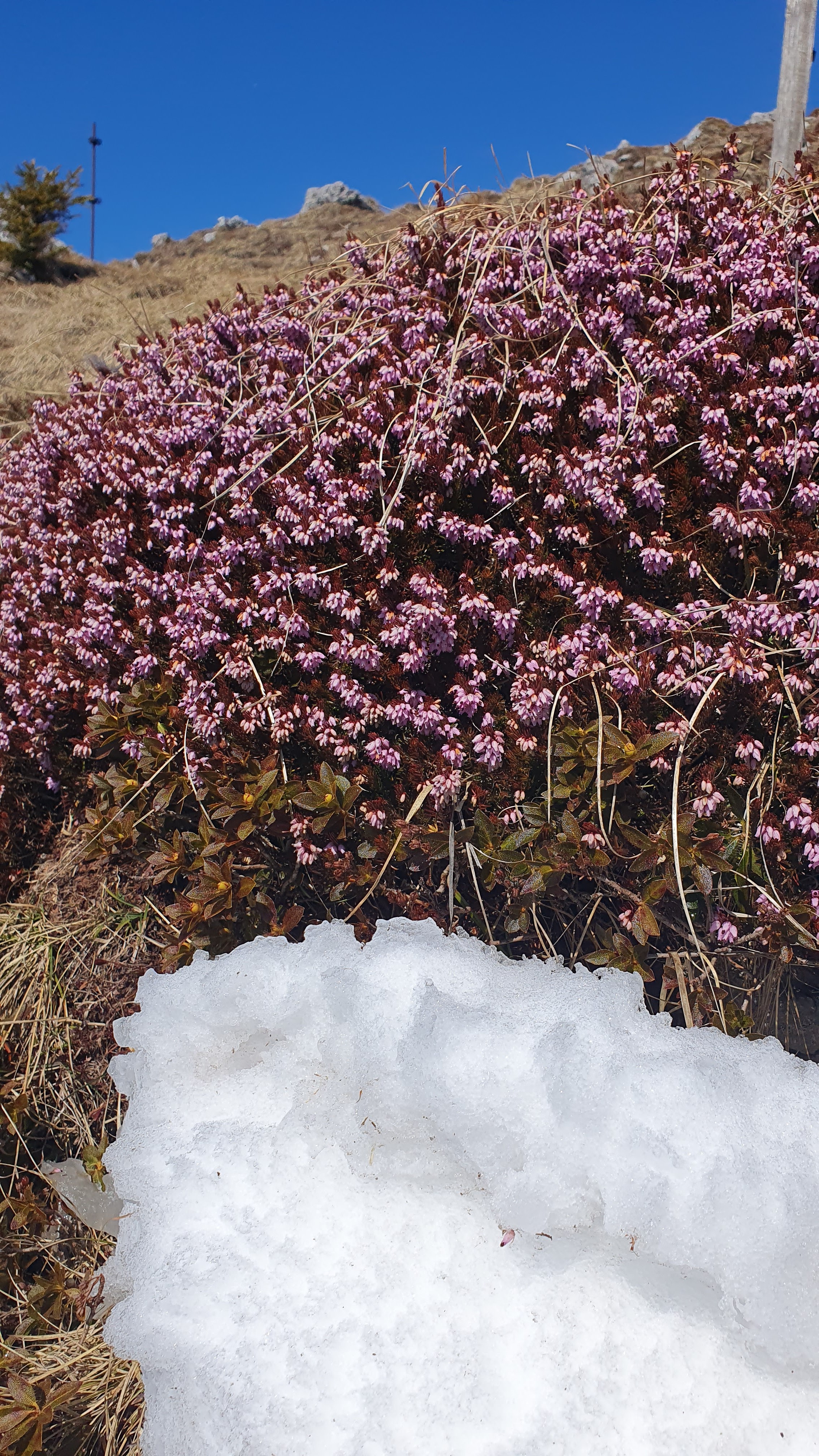 Izlazimo na prijevoj Povden (Poden), raskršće putova. 1 h 10 min imamo do Krekove koče ispod najvišeg vrha Altemaver, stoji na putokazu. Staza je osunčana, a to znači da se snijeg otopio i probijaju se raskošni grmovi rozog vrijeska. Već zbog toga je vrijedilo doći!