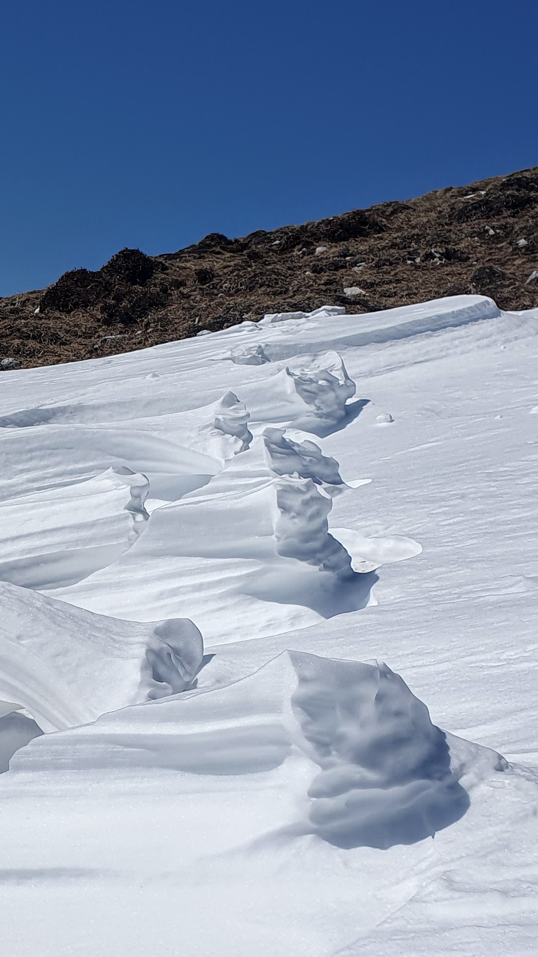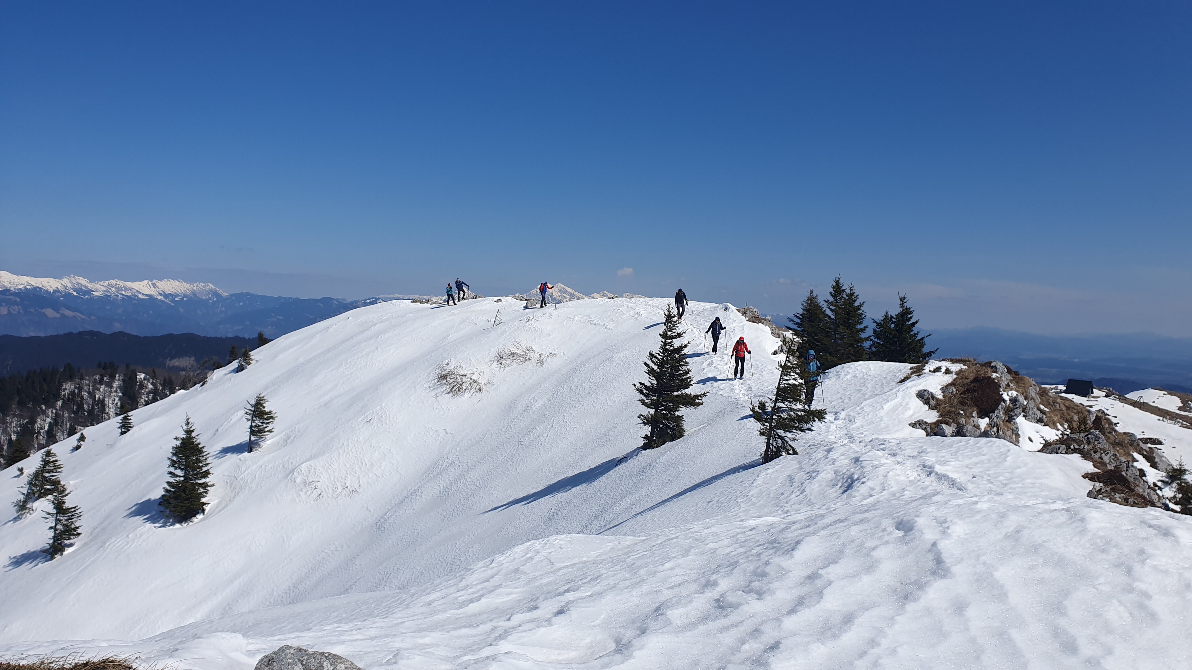 Sad je naš put jednostavan, bijeli čvrsti snijeg, uspon, grebenska staza, još jedno brdašce, otvoren pogled na sve strane, iako je ipak poželjno gledati pod noge.
